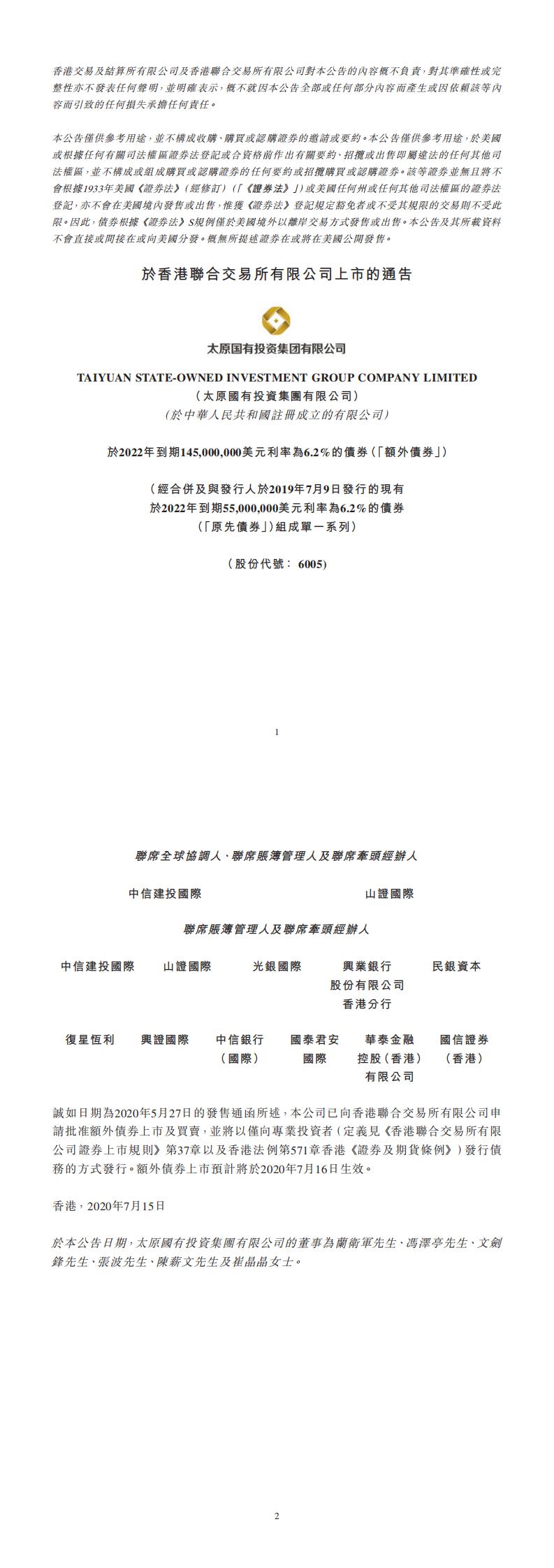 有關在香港聯(lián)合交易所有限公司上市的通知 — 太原國有投資集團有限公司 — 發(fā)行於二零二二年到期金額為145,000,000美元的6.2%債券