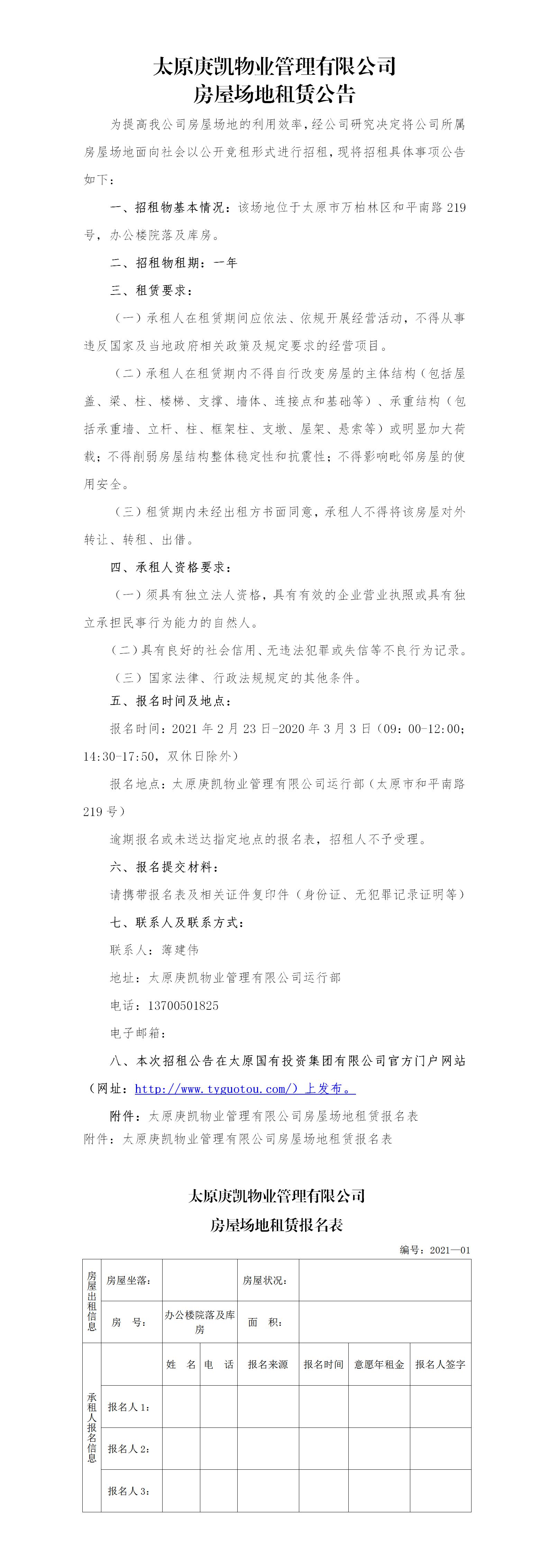 太原庚凱物業(yè)管理有限公司房屋場地租賃公告(二十二)