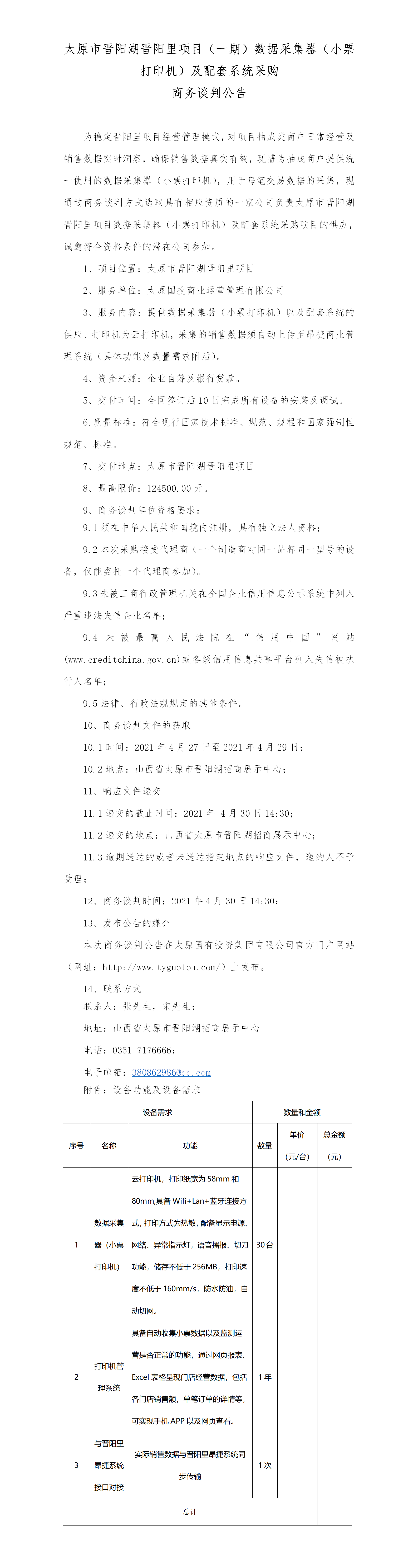 太原市晉陽湖晉陽里項目(一期)數(shù)據(jù)采集器(小票打印機(jī))及配套系統(tǒng)采購項目