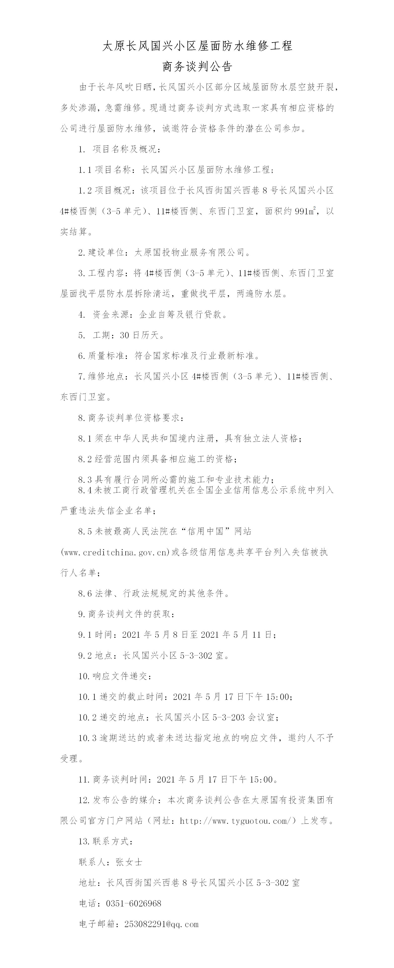 太原長風國興小區(qū)屋面防水維修工程商務談判公告