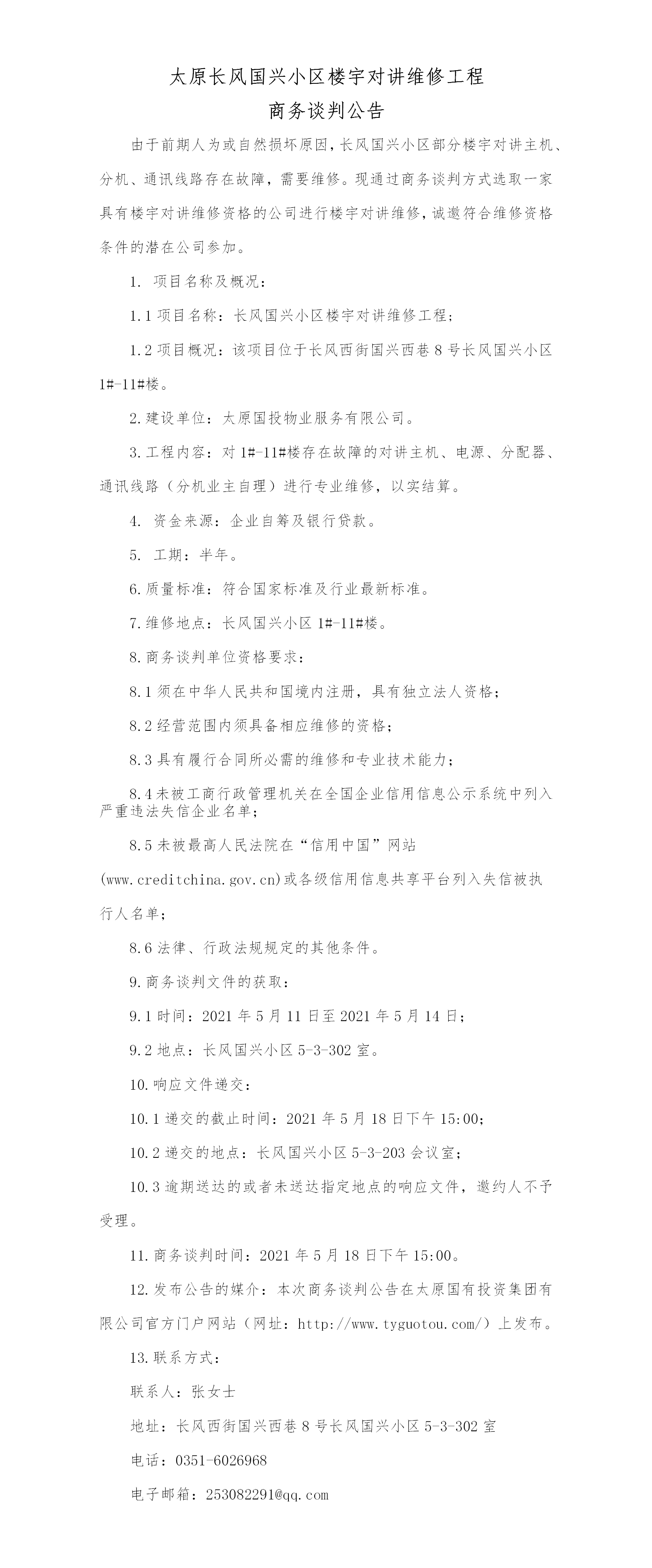 太原長(zhǎng)風(fēng)國(guó)興小區(qū)樓宇對(duì)講維修商務(wù)談判公告