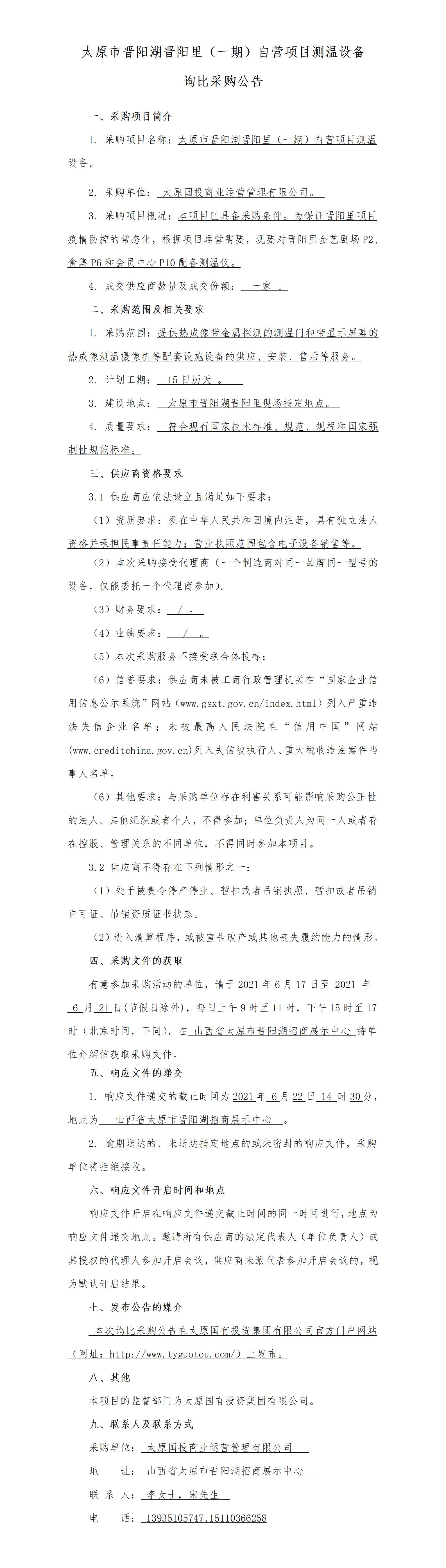 太原市晉陽湖晉陽里(一期)自營項(xiàng)目測溫設(shè)備詢比采購公告