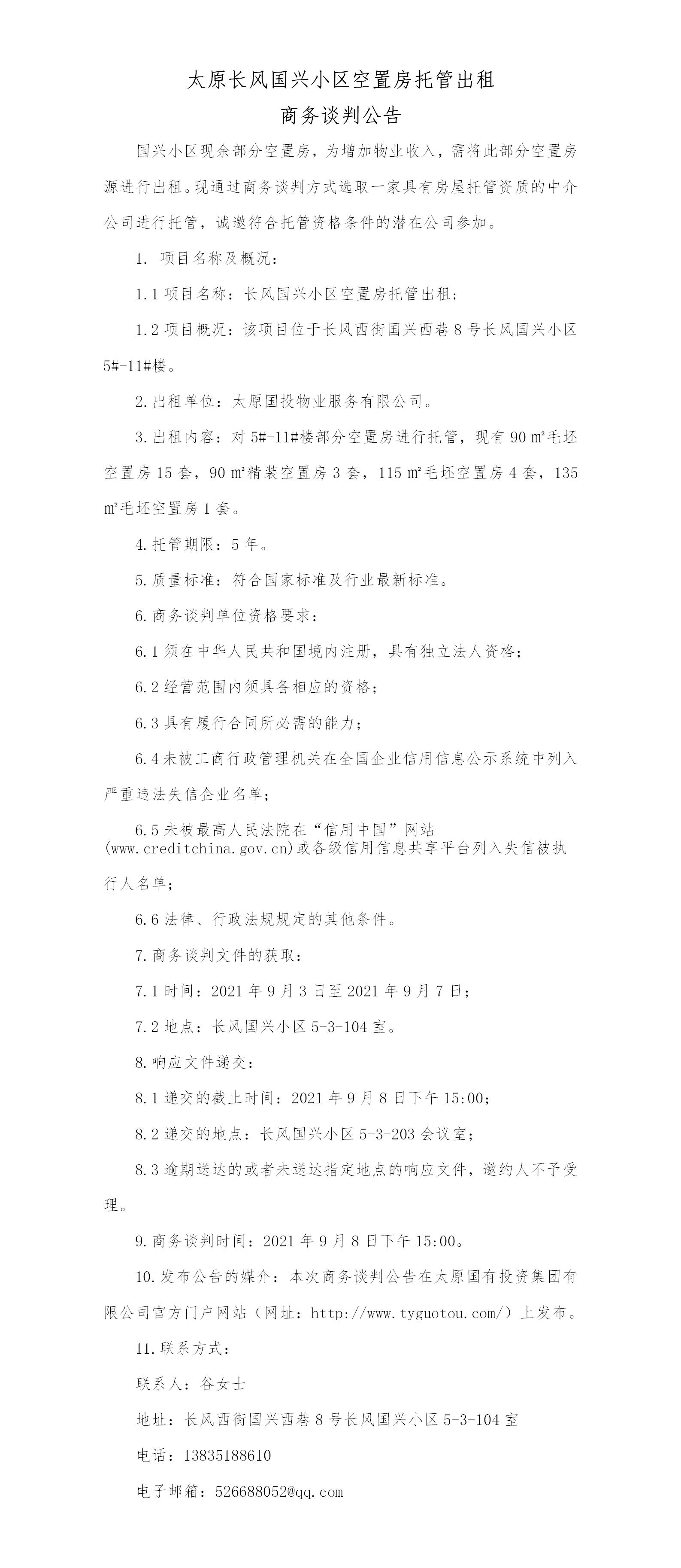 太原長風(fēng)國興小區(qū)空置房托管出租商務(wù)談判公告
