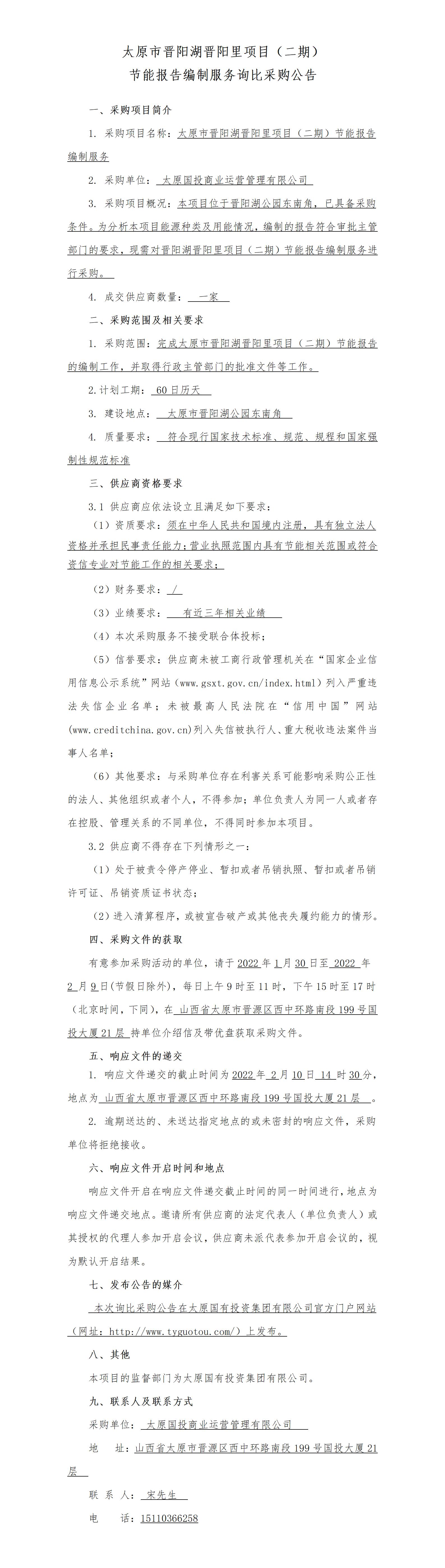 太原市晉陽湖晉陽里項目(二期)節(jié)能報告編制服務詢比采購公告