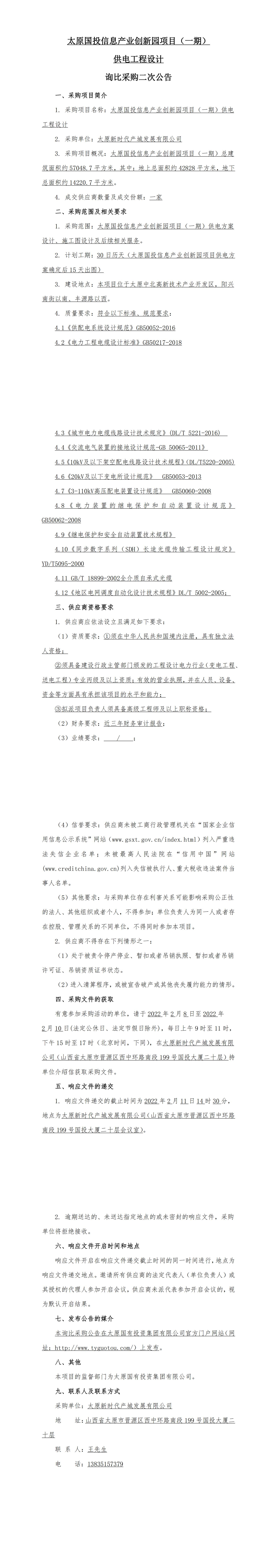 太原國投信息產(chǎn)業(yè)創(chuàng)新園項目(一期)供電工程設計詢比采購二次公告