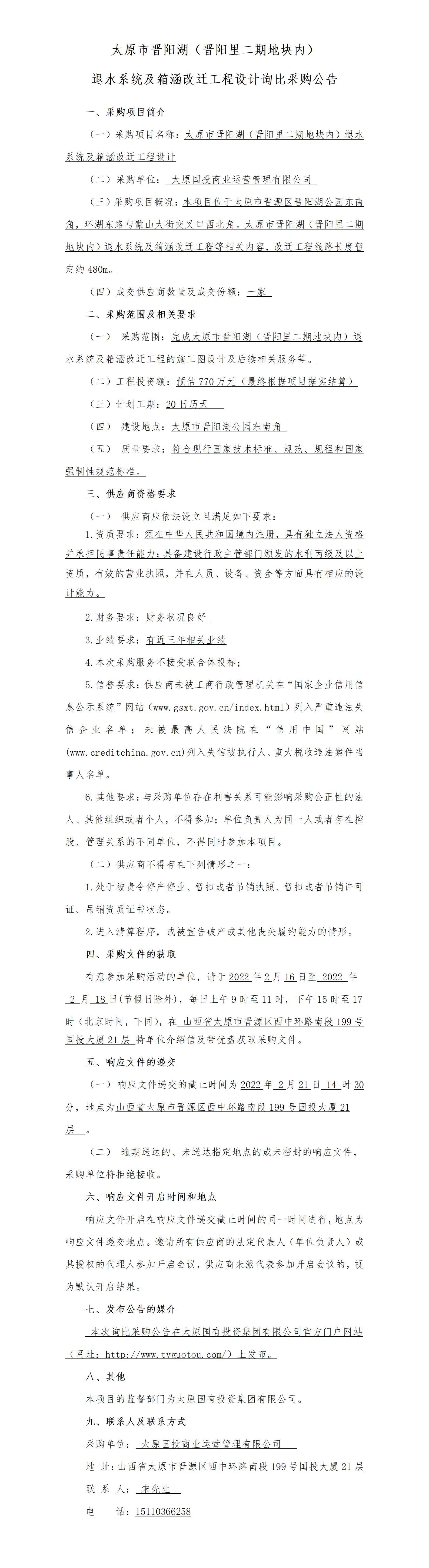 太原市晉陽湖(晉陽里二期地塊內(nèi))退水系統(tǒng)及箱涵改遷工程設計詢比采購公告(1)