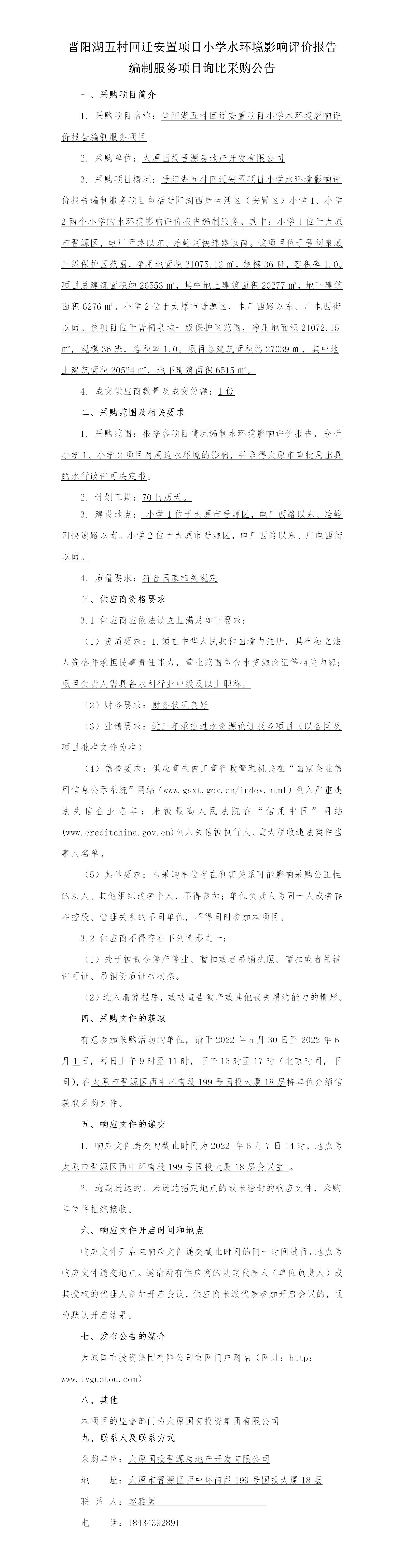 晉陽湖五村回遷安置項(xiàng)目小學(xué)水環(huán)境影響評(píng)價(jià)報(bào)告編制服務(wù)項(xiàng)目詢比采購公告
