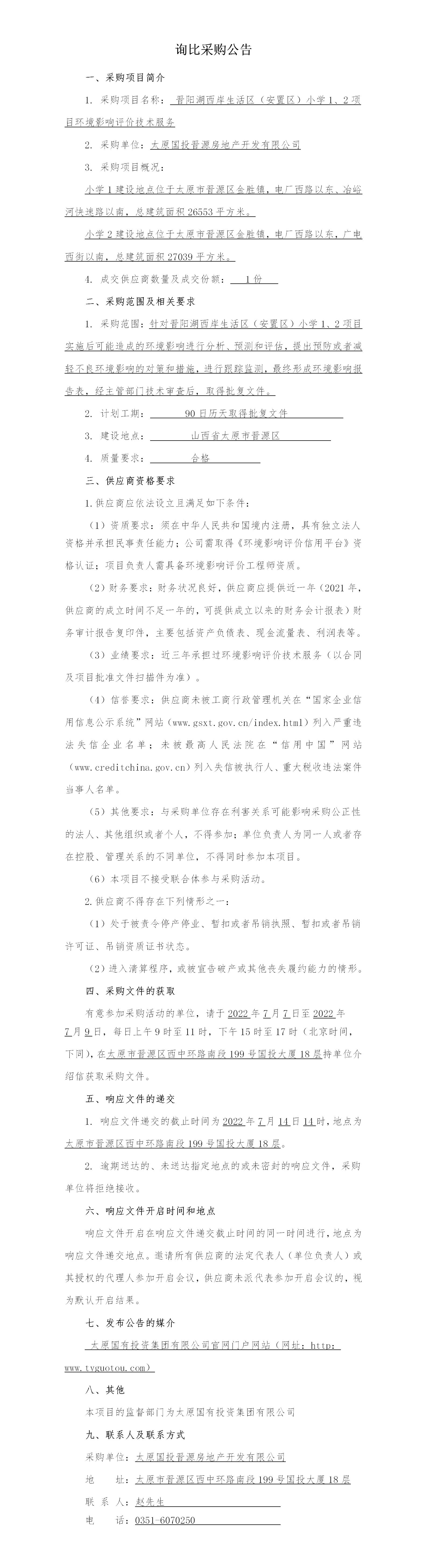 晉陽湖西岸生活區(qū)(安置區(qū))小學(xué)1、2項目環(huán)境影響評價技術(shù)服務(wù)詢比采購公告