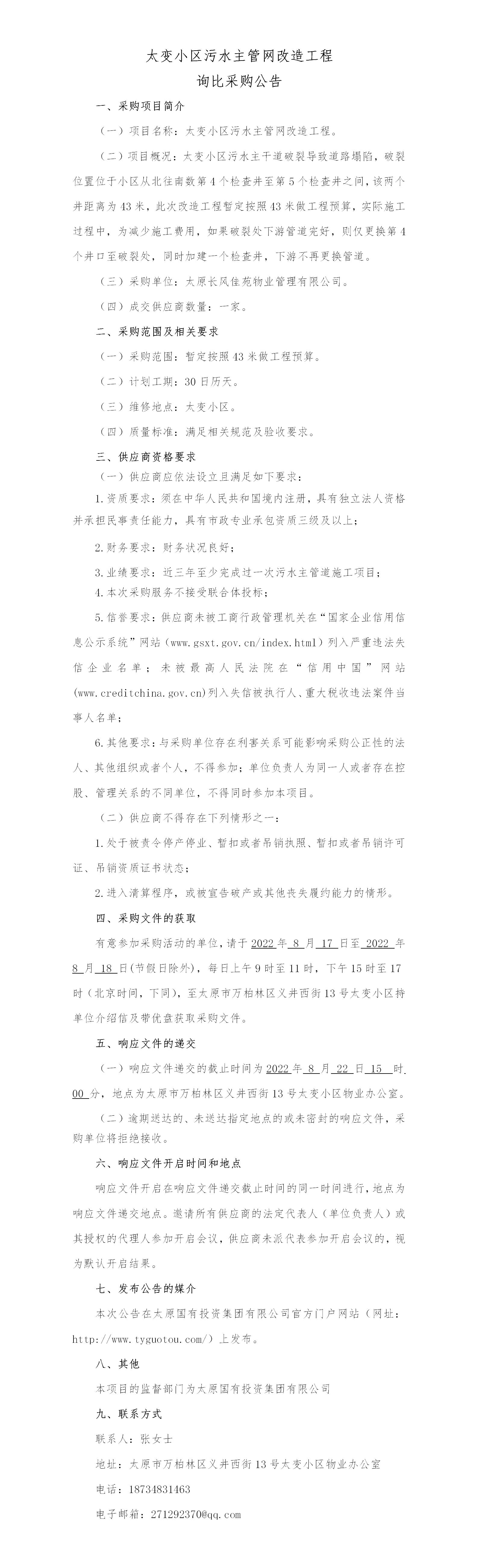 太變小區(qū)污水主管網(wǎng)改造工程詢比采購公告