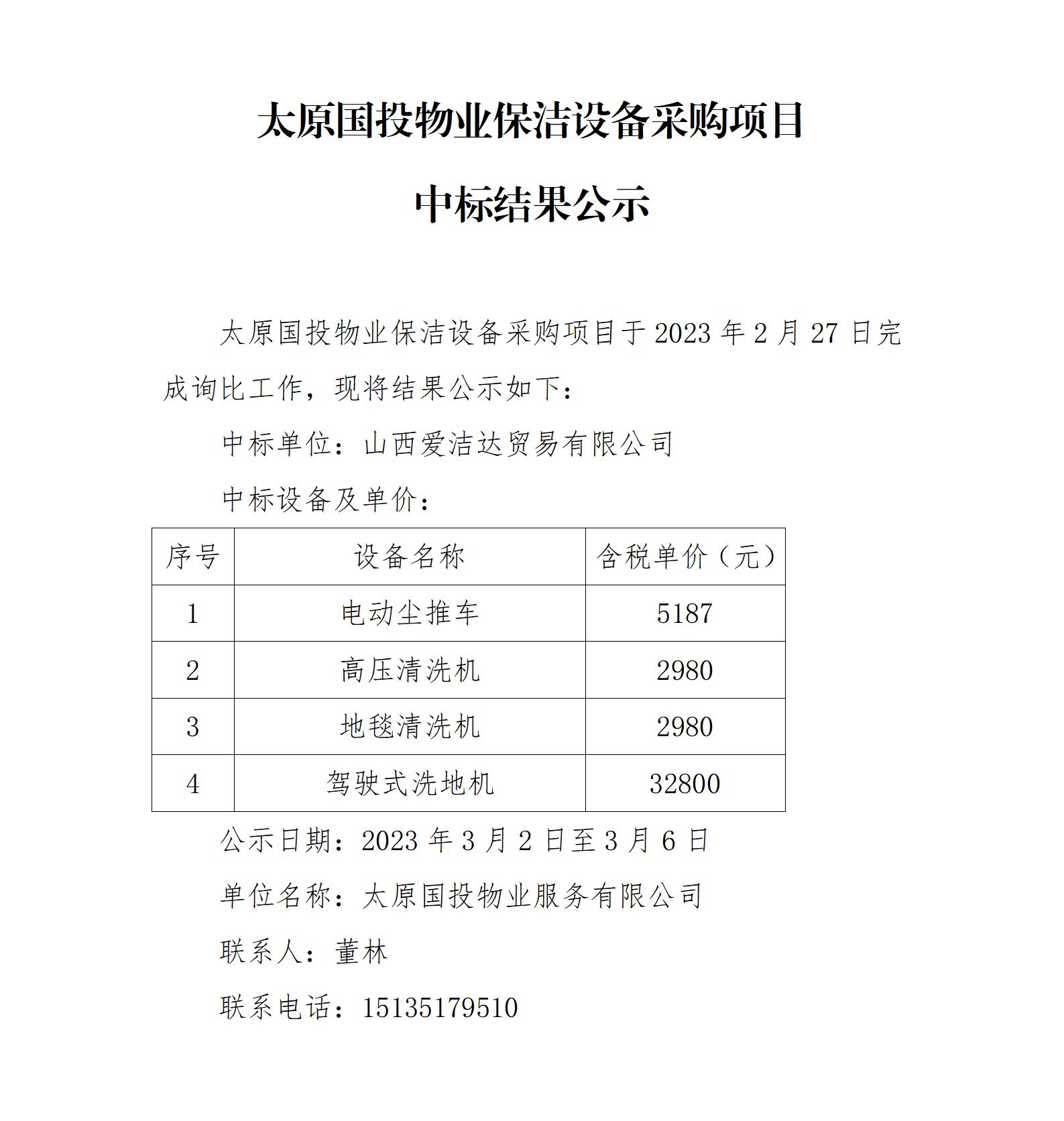 太原國投物業(yè)保潔設(shè)備采購項目中標(biāo)結(jié)果公示