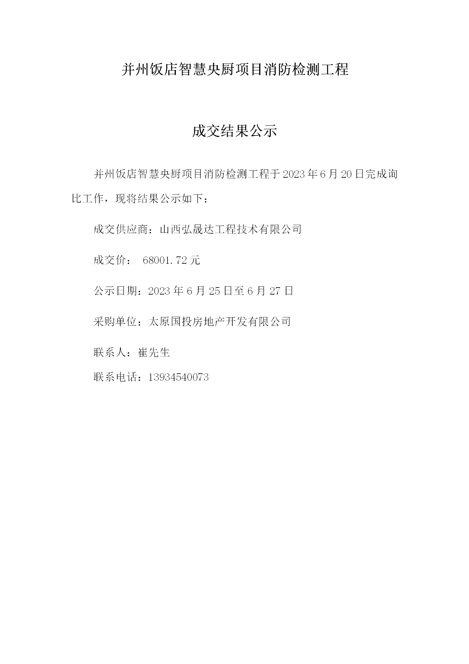 并州飯店智慧央廚項(xiàng)目消防檢測(cè)工程成交結(jié)果公示