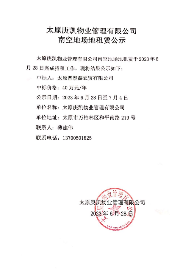 庚凱公司南空地項目場地租賃公示