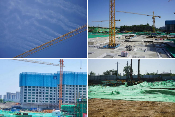 綠色的苫蓋網(wǎng)將裸漏的黃土牢牢覆蓋,最大程度的預(yù)防揚(yáng)塵污染。塔吊高空噴淋系統(tǒng)以及圍擋噴淋系統(tǒng)智能、有效、精準(zhǔn)的進(jìn)行工地?fù)P塵控制,空氣中的水霧可以將飄浮在空氣中的污染顆粒物、塵埃等迅速逼降地面,達(dá)到清潔凈化空氣的效果。正在建設(shè)的樓棟外墻窗洞口被防塵網(wǎng)包裹,以一定幾何形狀、開孔率和不同孔形組合擋風(fēng)抑塵墻,使流通的空氣從外通過墻體時(shí),在墻體內(nèi)側(cè)形成上、下干擾的氣流以達(dá)到外側(cè)強(qiáng)風(fēng),內(nèi)側(cè)弱風(fēng),外側(cè)小風(fēng),內(nèi)側(cè)無風(fēng)的效果,防止粉塵的飛揚(yáng)。