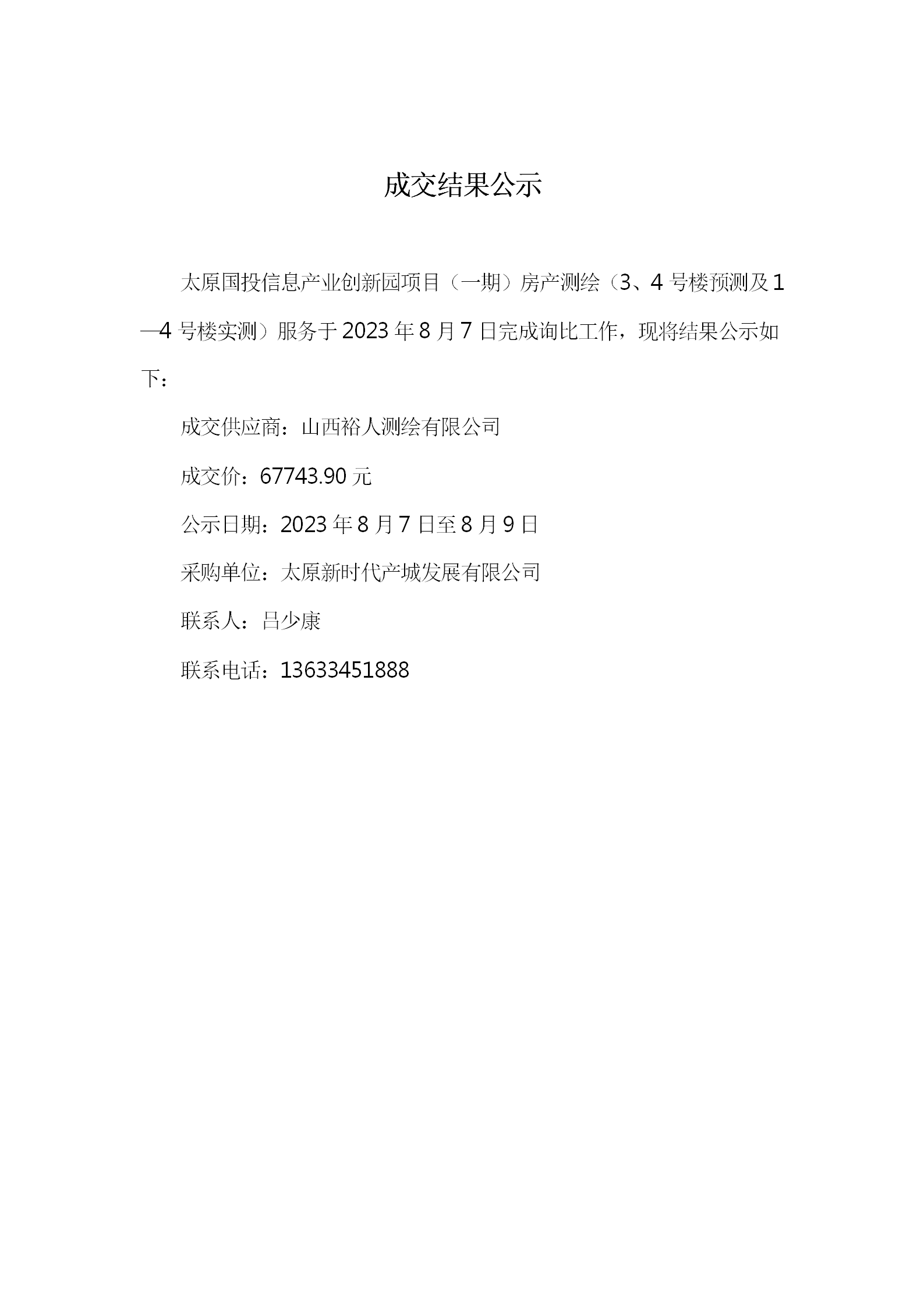 太原國投信息產(chǎn)業(yè)創(chuàng)新園項(xiàng)目(一期)房產(chǎn)測(cè)繪(3、4號(hào)樓預(yù)測(cè)及1-4號(hào)樓實(shí)測(cè))服務(wù)采購詢比成交結(jié)果公示