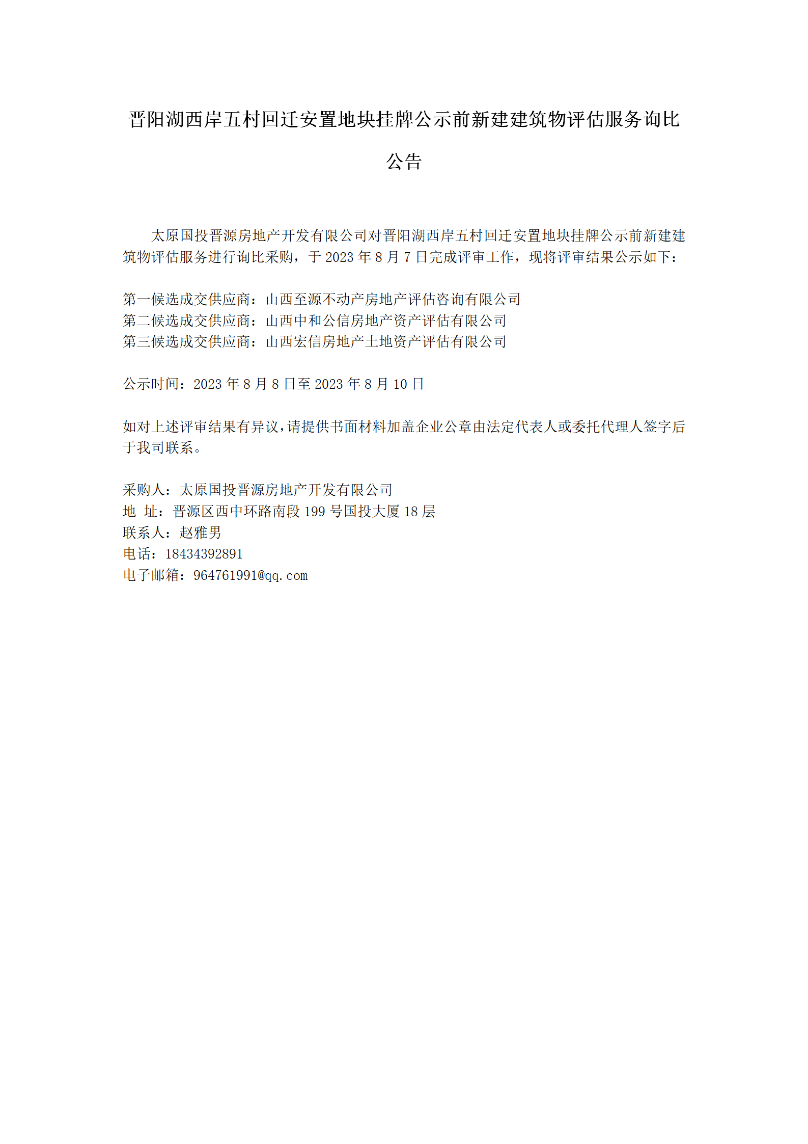 晉陽(yáng)湖西岸五村回遷安置地塊掛牌公示前新建建筑物評(píng)估服務(wù)詢(xún)比候選人公示