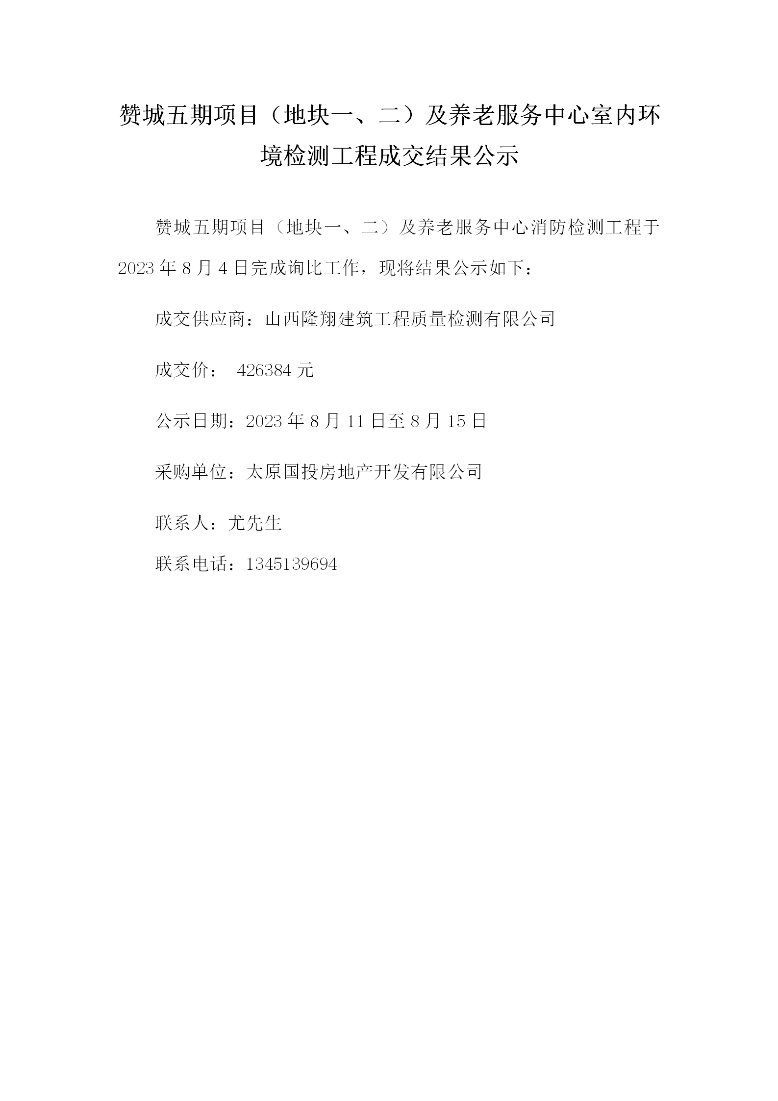 贊城五期項目(地塊一、二)及養(yǎng)老服務中心室內(nèi)環(huán)境檢測工程成交結(jié)果公示