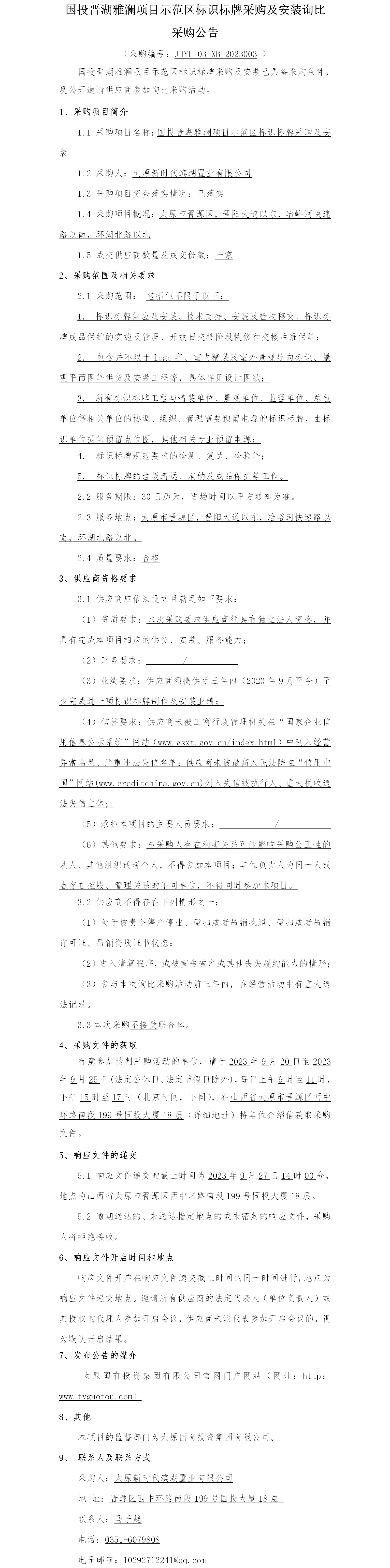 國投晉湖雅瀾項目示范區(qū)標識標牌采購及安裝詢比采購公告
