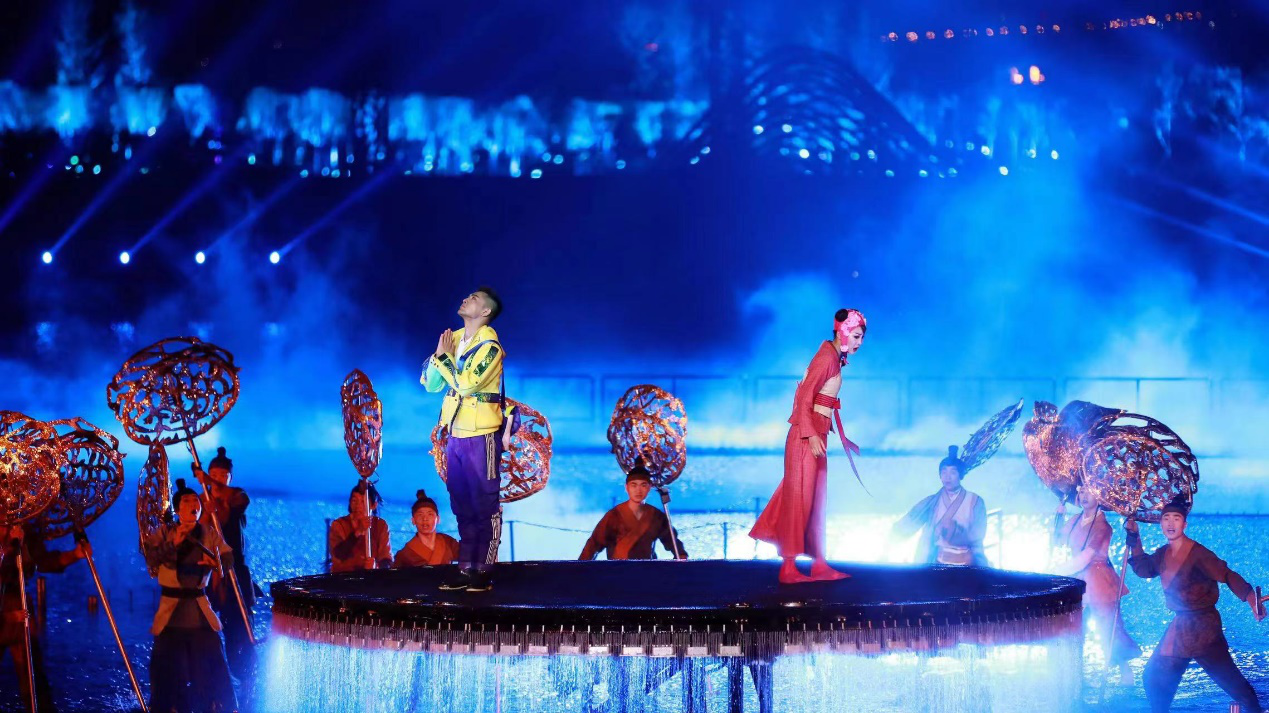 演出現(xiàn)場(chǎng),流淌的水波光影從湖中心蔓延至觀眾腳下,如夢(mèng)如幻。震撼視覺的火焰場(chǎng)景和撲面而來的熱浪,讓人如同身臨其境。湖光山色、燈光水影中,上百架無人機(jī)夜空作畫,似漫天流星伴著璀璨光芒劃過天際,給觀眾帶來了浪漫唯美的沉浸式體驗(yàn)。