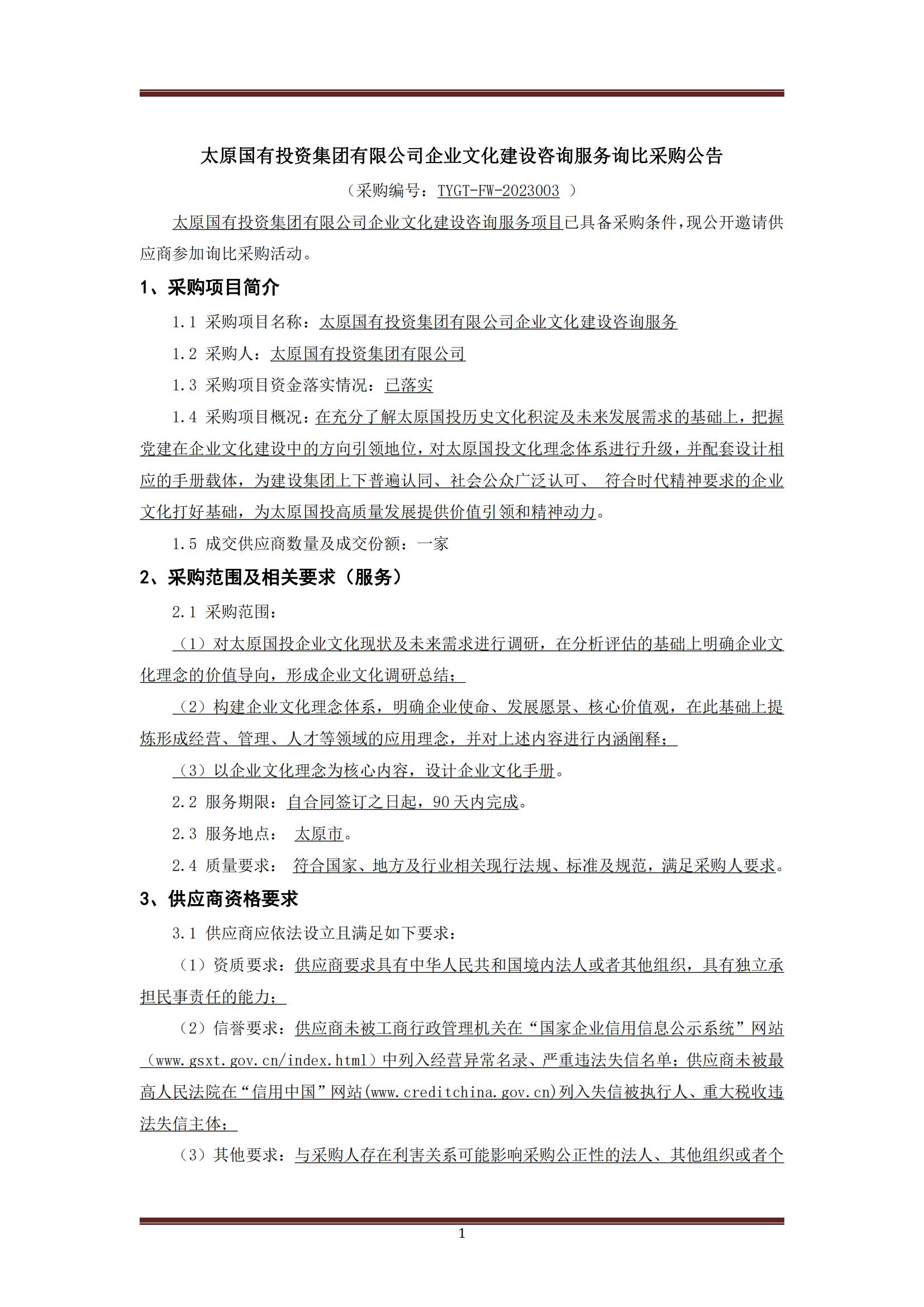 太原國有投資集團有限公司企業(yè)文化建設咨詢服務詢比采購公告