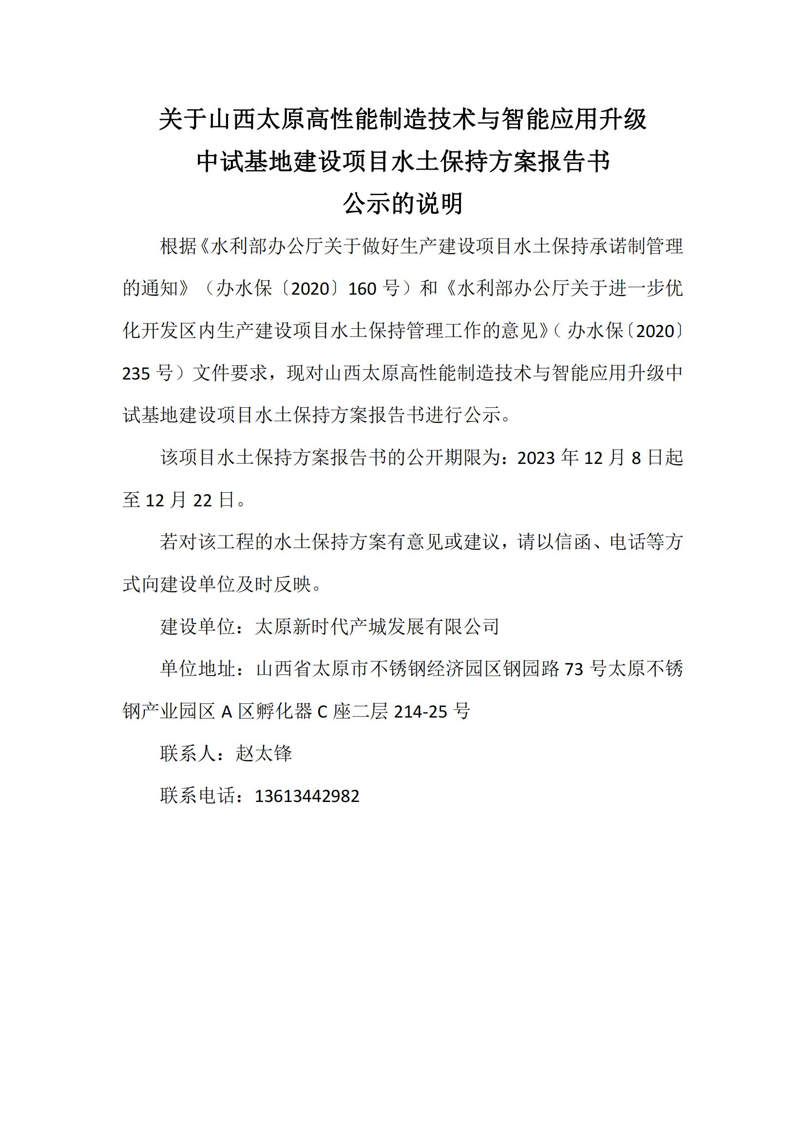 山西太原高性能制造技術與智能應用升級 中試基地建設項目水土保持方案報告書公示