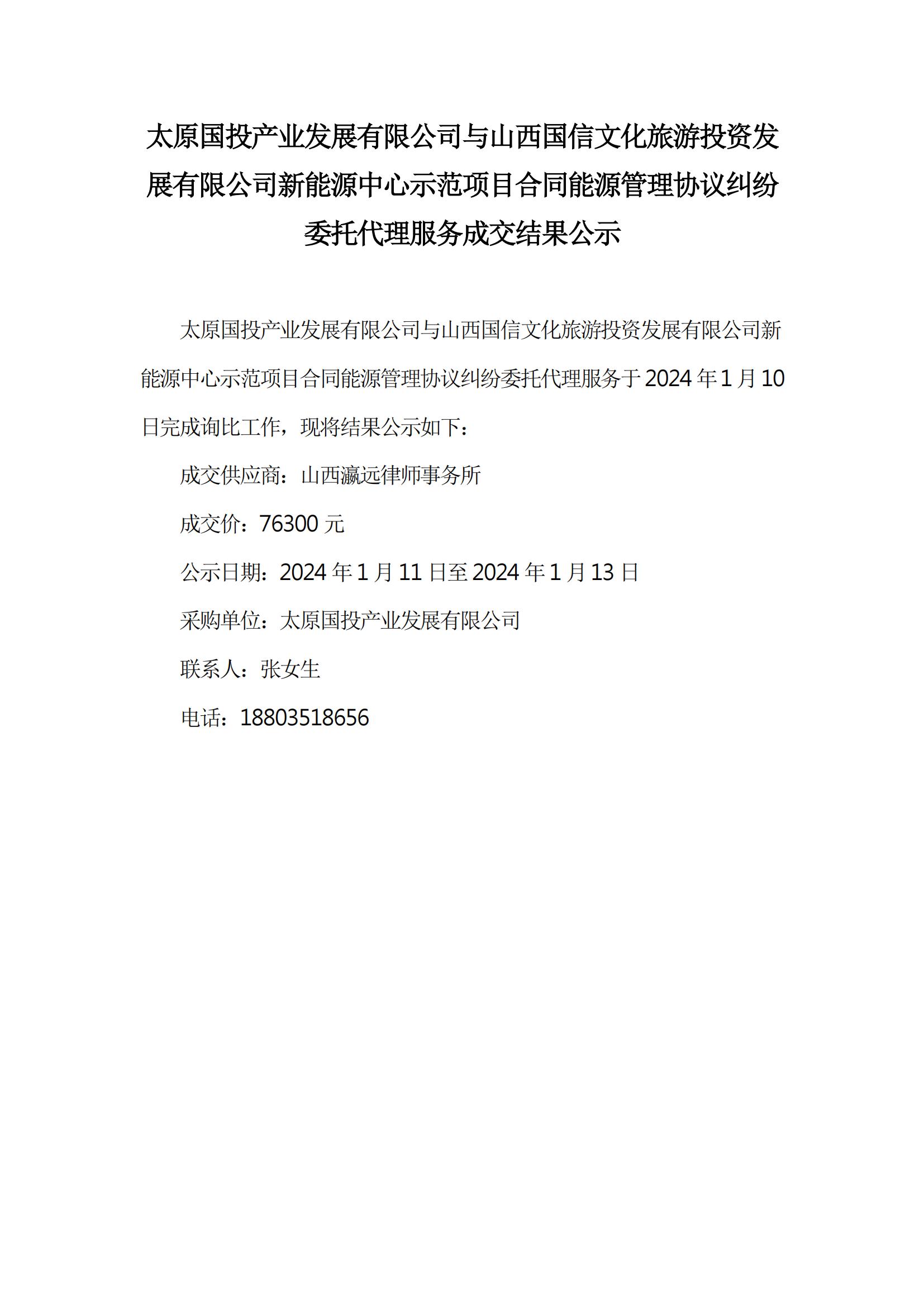 太原國投產(chǎn)業(yè)發(fā)展有限公司與山西國信文化旅游投資發(fā)展有限公司新能源中心示范項目合同能源管理協(xié)議糾紛委托代理成交結(jié)果公示