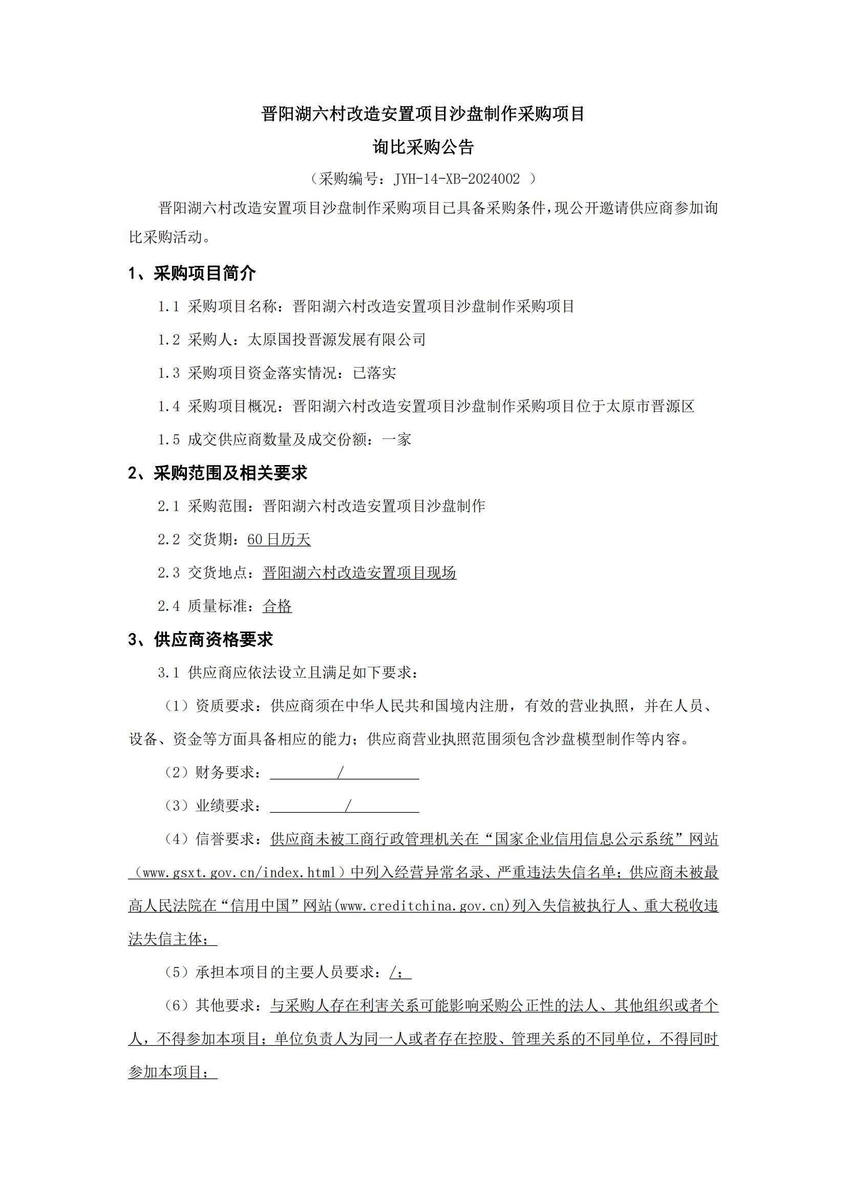 晉陽湖六村改造安置項目沙盤制作采購項目詢比采購公告