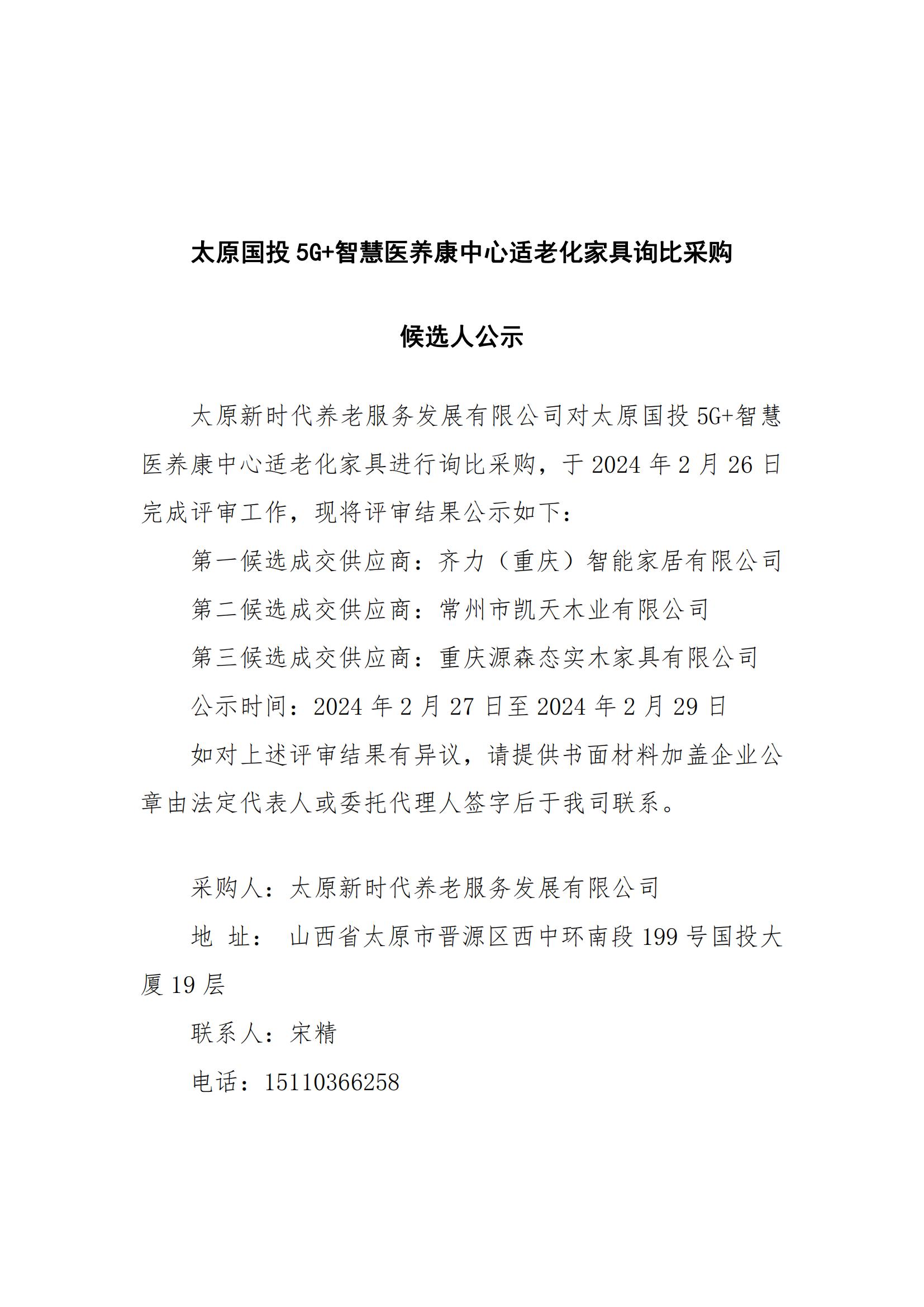 太原國投5G+智慧醫(yī)養(yǎng)康中心適老化家具詢比采購候選人公示