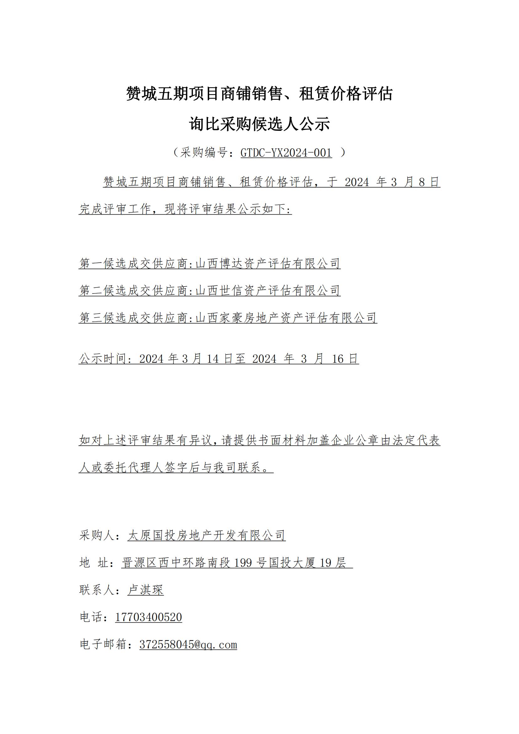 贊城五期項(xiàng)目商鋪銷售、租賃價(jià)格評(píng)估詢比采購候選人公示