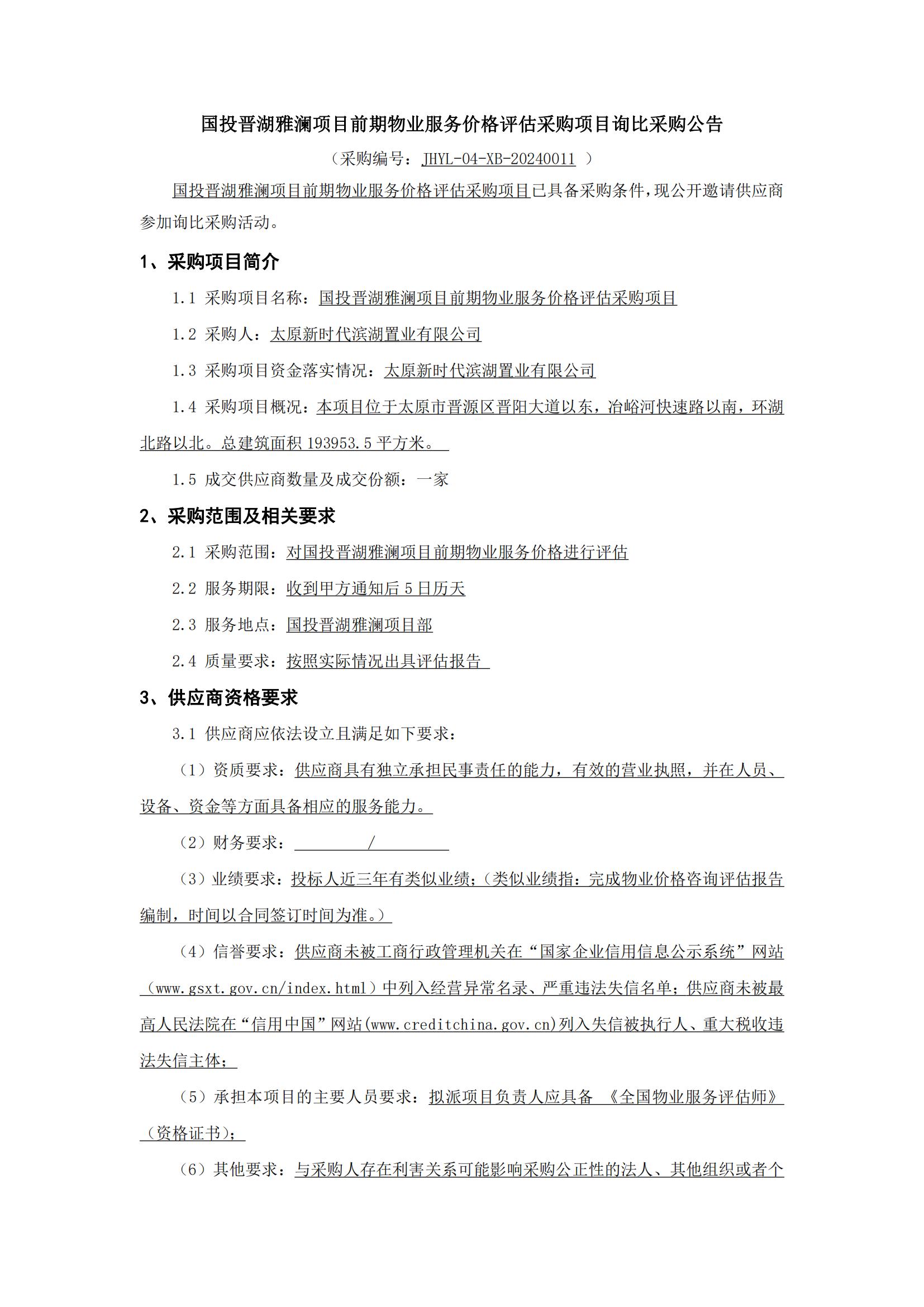 國投晉湖雅瀾項(xiàng)目前期物業(yè)服務(wù)價(jià)格評(píng)估采購項(xiàng)目詢比采購公告