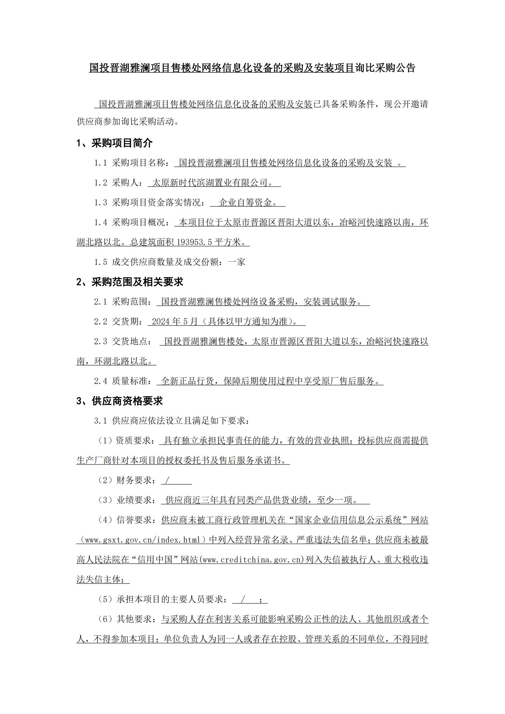 國投晉湖雅瀾項目售樓處網絡信息化設備的采購及安裝項目詢比采購公告