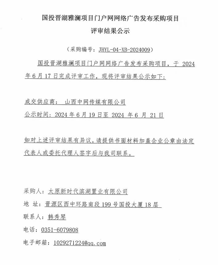 晉湖雅瀾項(xiàng)目門戶網(wǎng)網(wǎng)絡(luò)廣告發(fā)布采購(gòu)項(xiàng)目結(jié)果公示