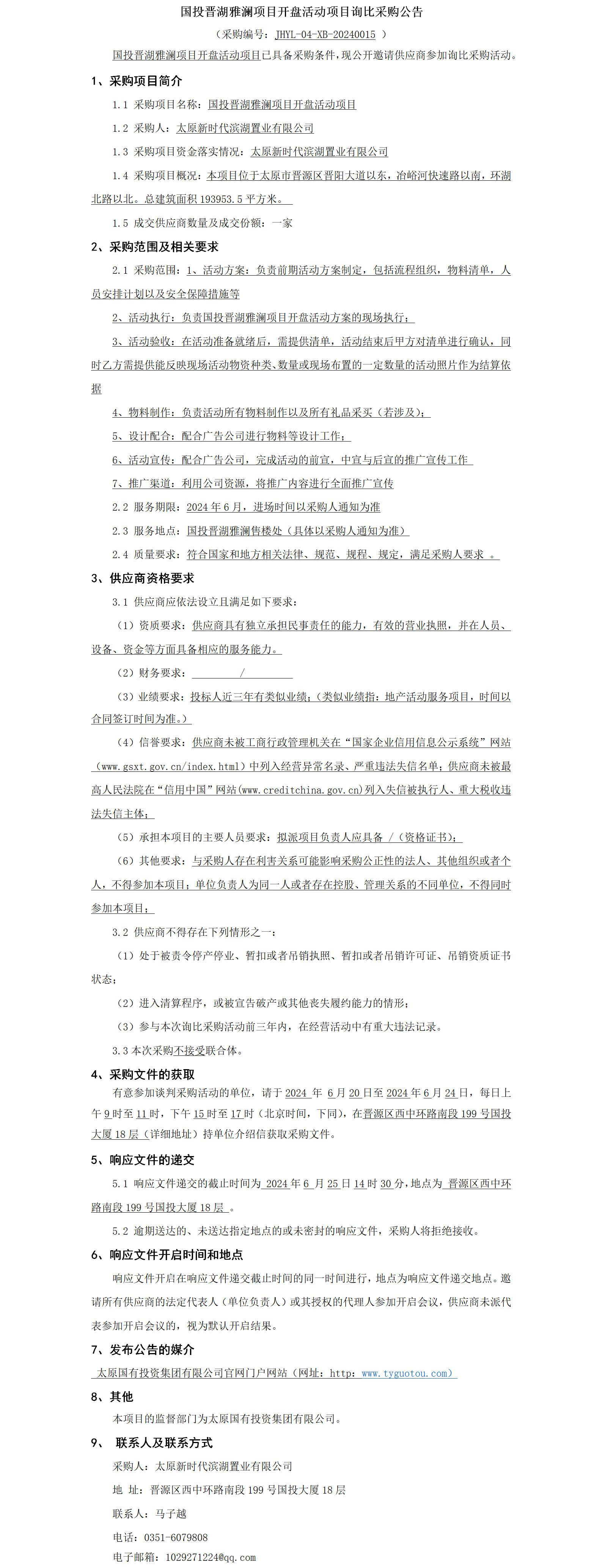 國投晉湖雅瀾項目開盤活動項目詢比采購公告