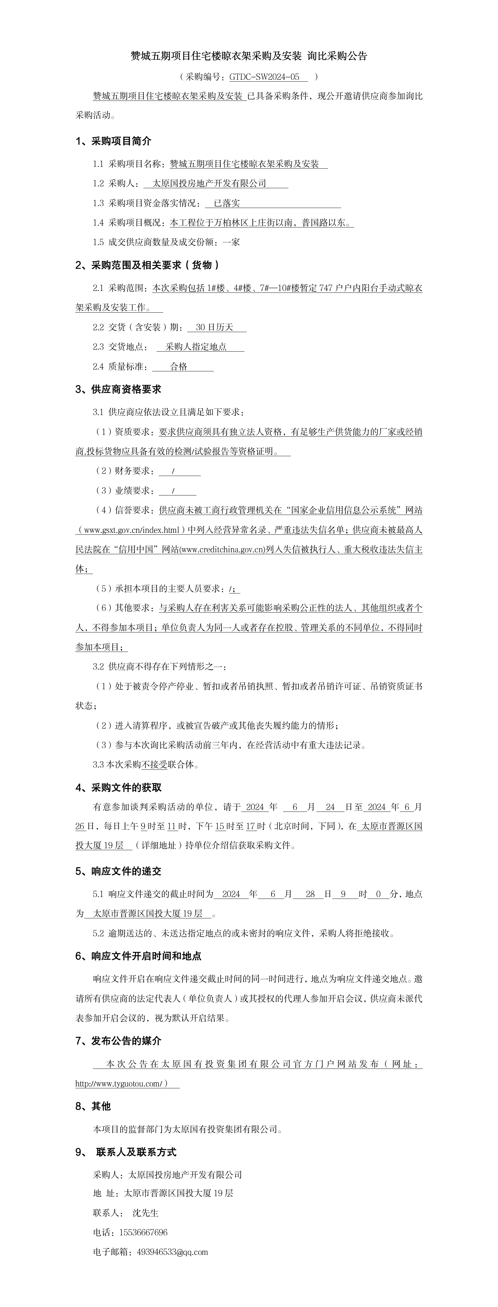 贊城五期項(xiàng)目住宅樓晾衣架采購及安裝詢比采購公告