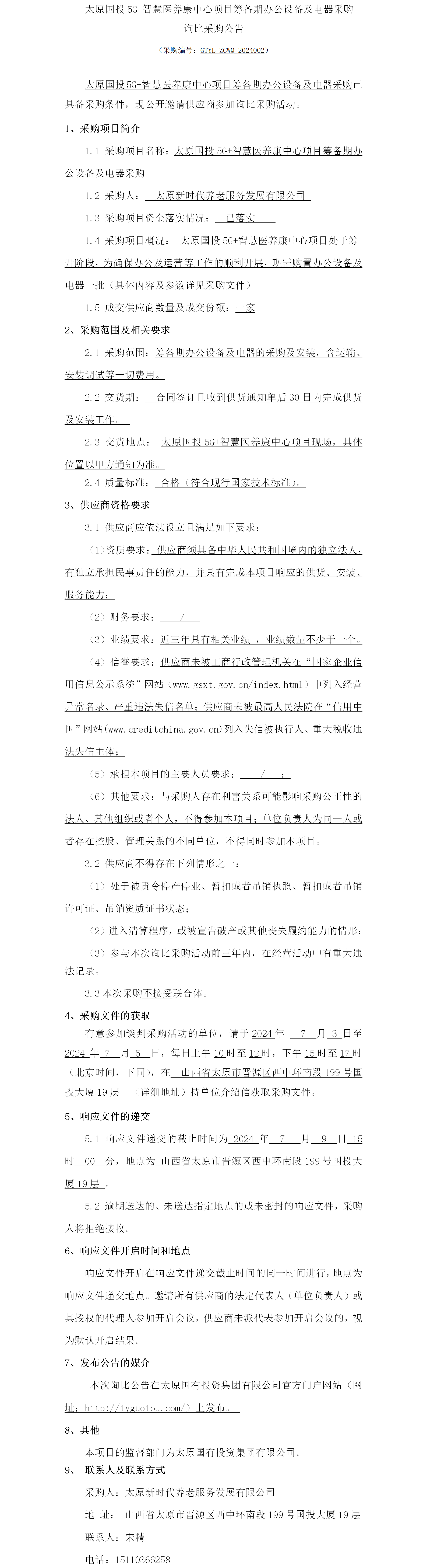 太原國投5G+智慧醫(yī)養(yǎng)康中心項目籌備期辦公設備及電器采購詢比采購公告