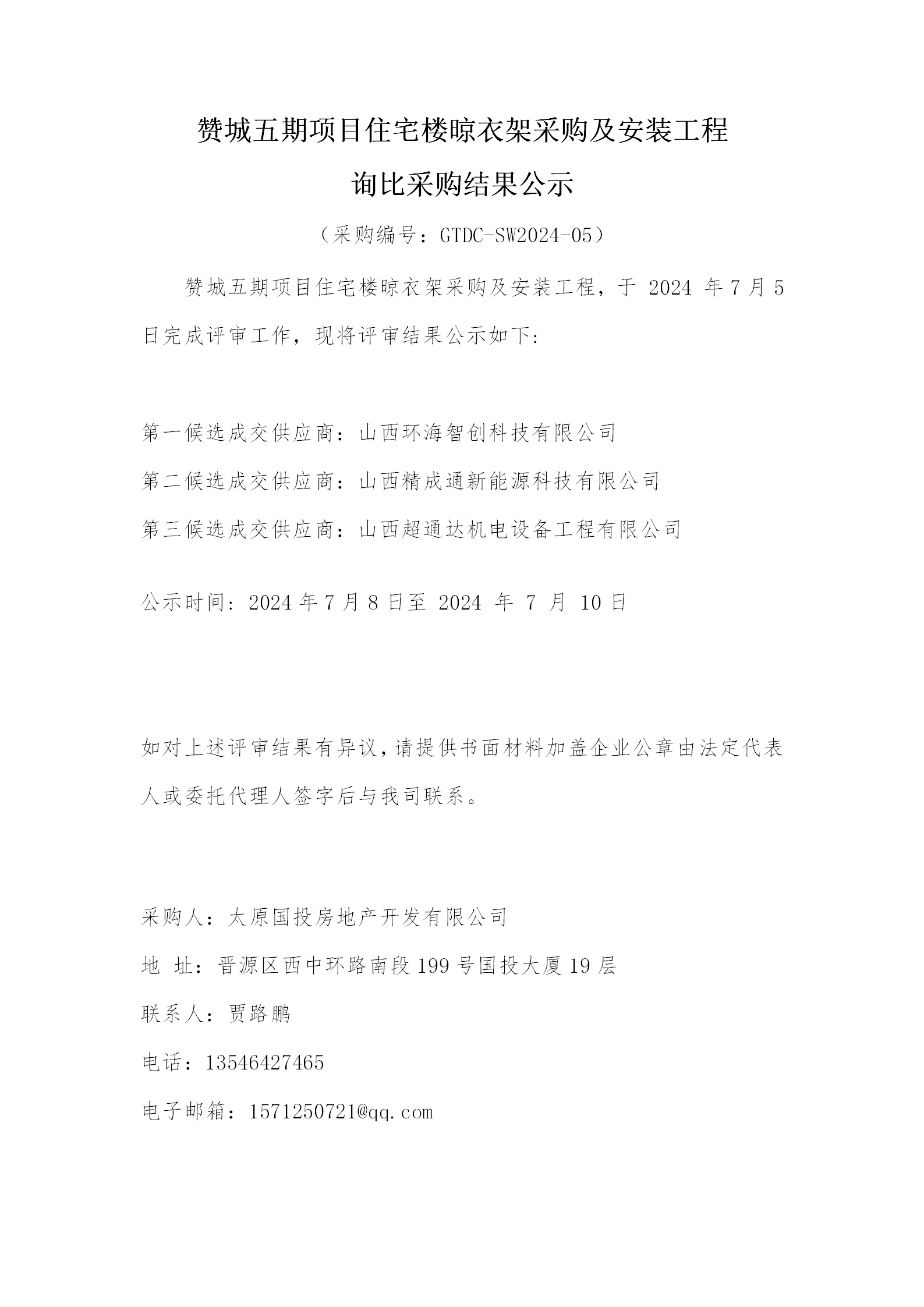 贊城五期項目住宅樓晾衣架采購及安裝工程詢比采購結(jié)果公示