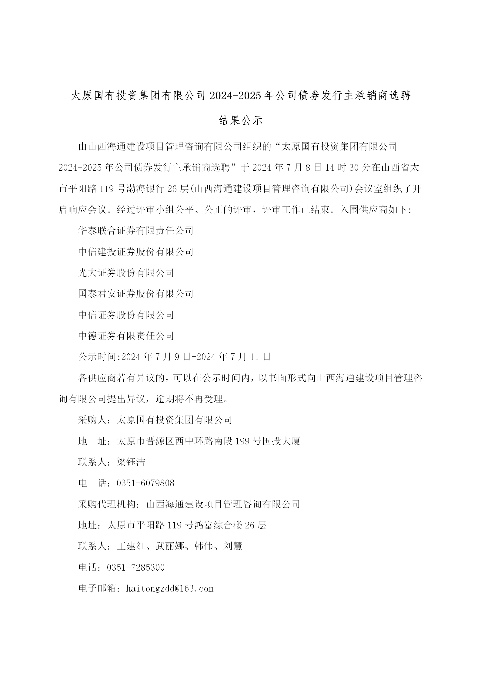 太原國有投資集團(tuán)有限公司2024-2025年公司債券發(fā)行主承銷商選聘結(jié)果公示