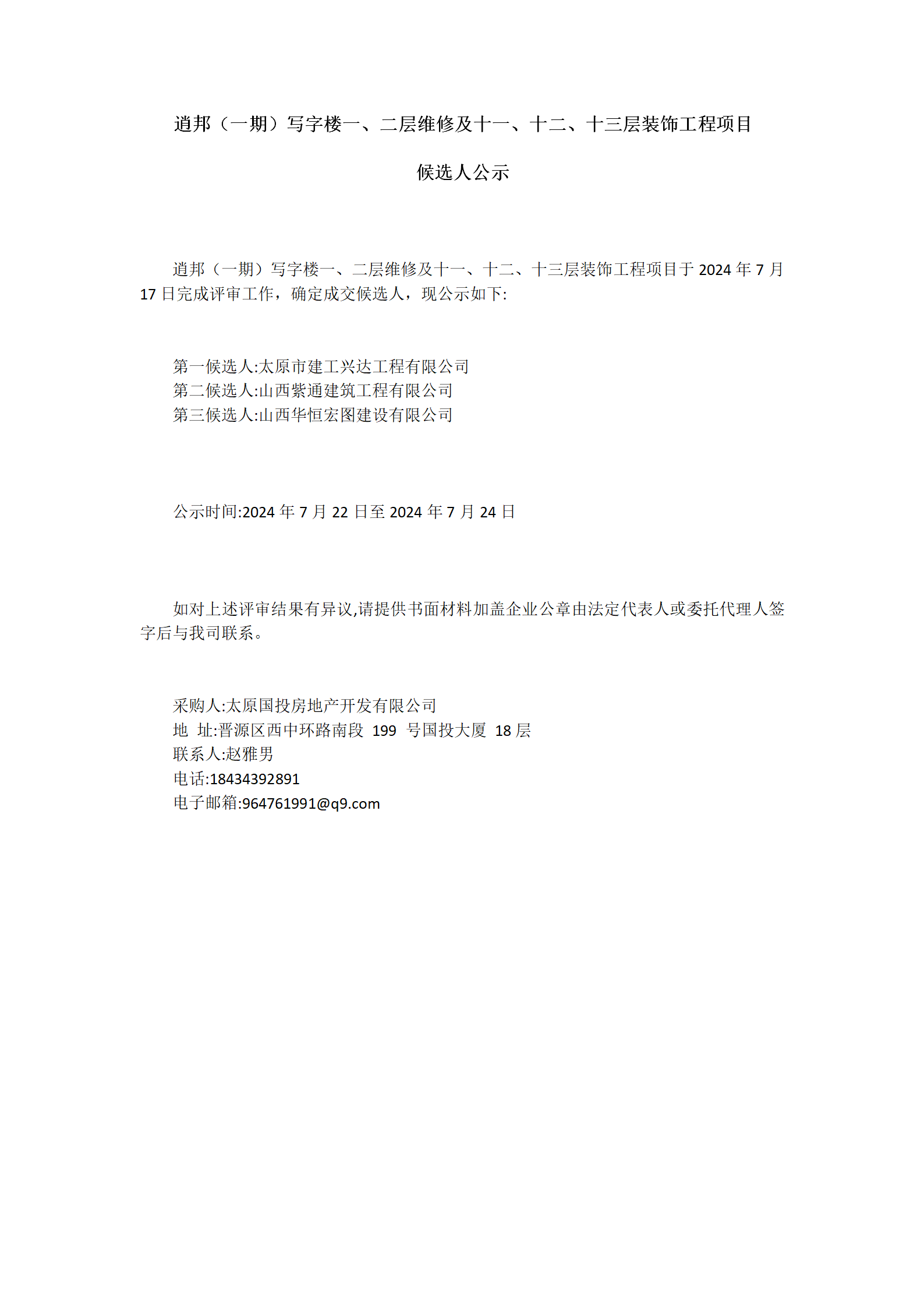 逍邦(一期)寫字樓一、二層維修及十一、十二、十三層裝飾工程項(xiàng)目候選人公示