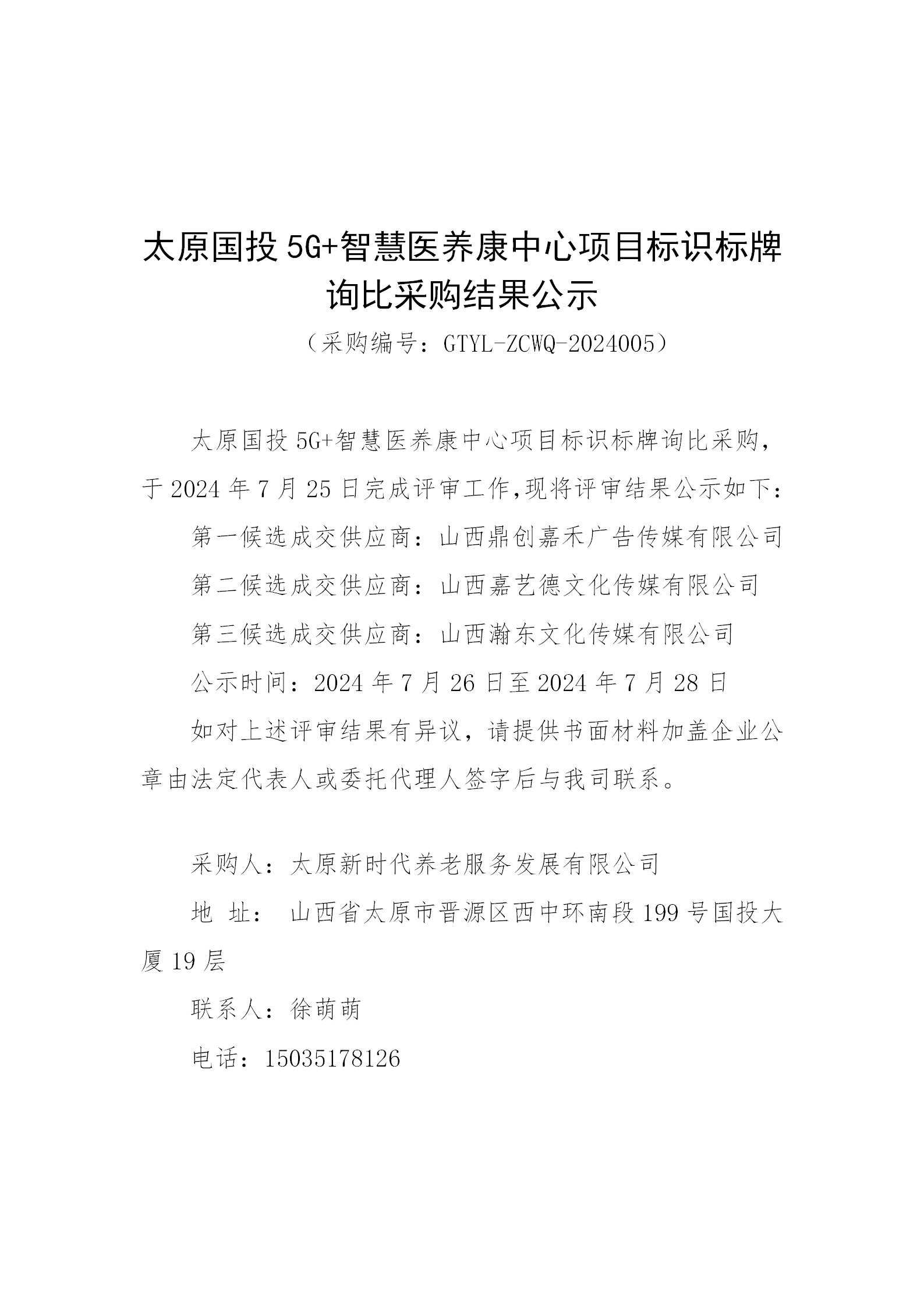 太原國(guó)投5G+智慧醫(yī)養(yǎng)康中心項(xiàng)目標(biāo)識(shí)標(biāo)牌詢(xún)比采購(gòu)結(jié)果公示