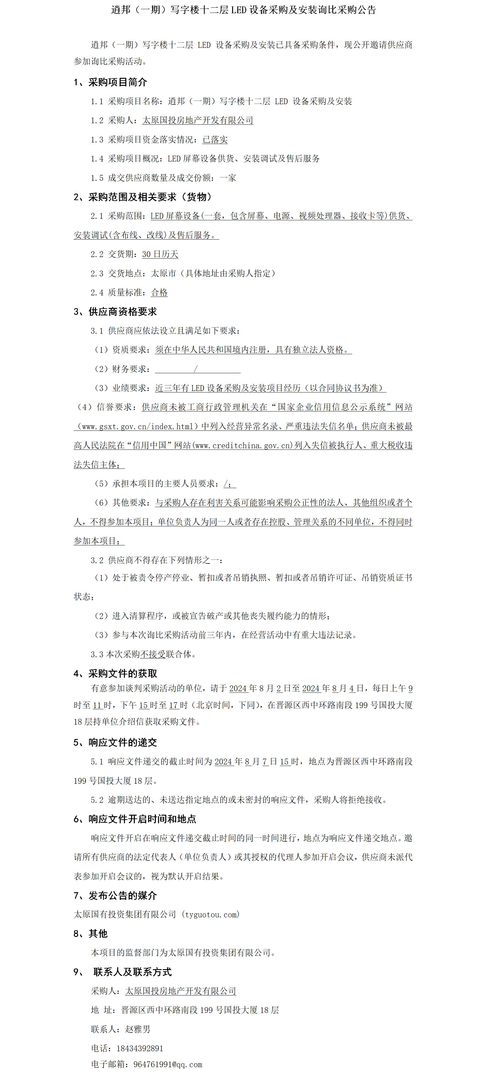 逍邦(一期)寫字樓十二層LED設(shè)備采購(gòu)及安裝詢比采購(gòu)公告