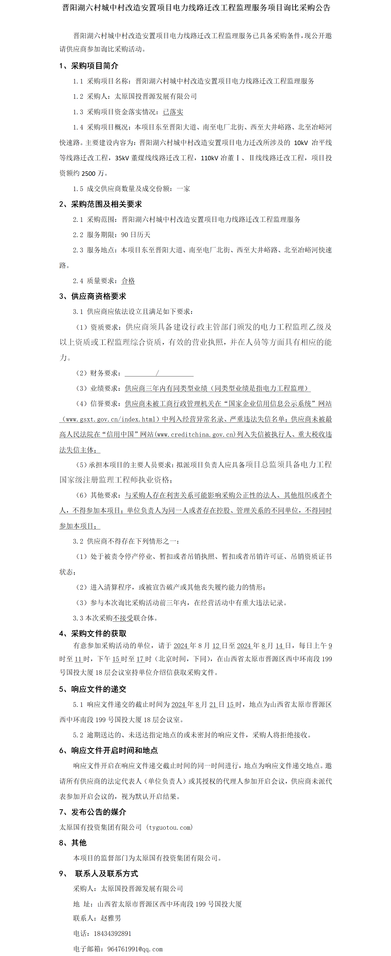 晉陽湖六村城中村改造安置項目電力線路遷改工程監(jiān)理服務(wù)項目詢比采購公告