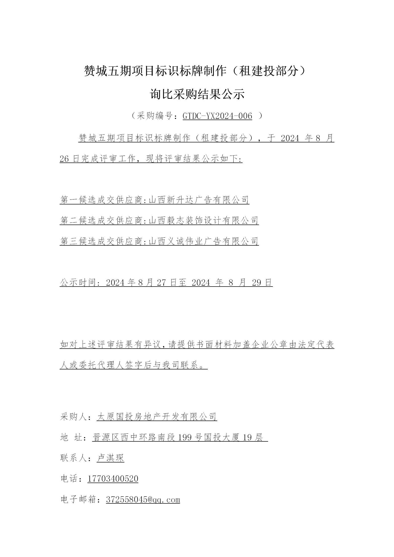 贊城五期項(xiàng)目標(biāo)識標(biāo)牌制作(租建投部分)詢比采購結(jié)果公示