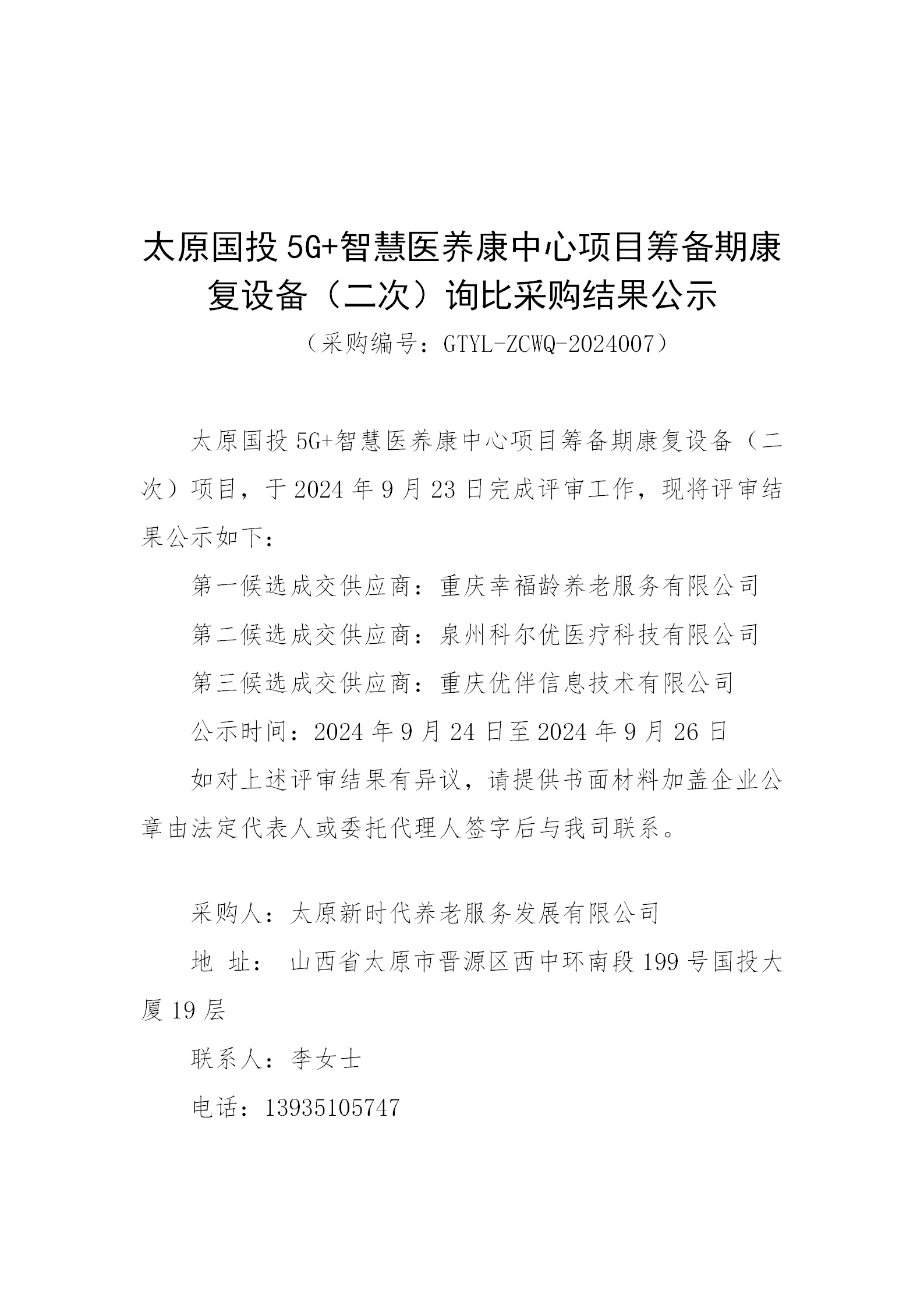 太原國投5G+智慧醫(yī)養(yǎng)康中心項目籌備期康復設備(二次)詢比采購結果公示