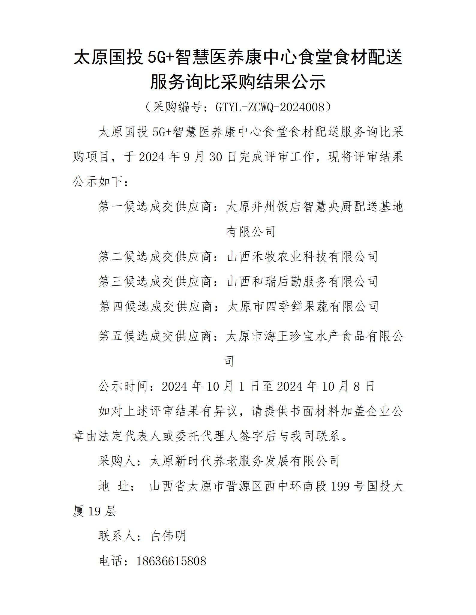 太原國(guó)投5G+智慧醫(yī)養(yǎng)康中心食堂食材配送服務(wù)詢比采購(gòu)結(jié)果公示