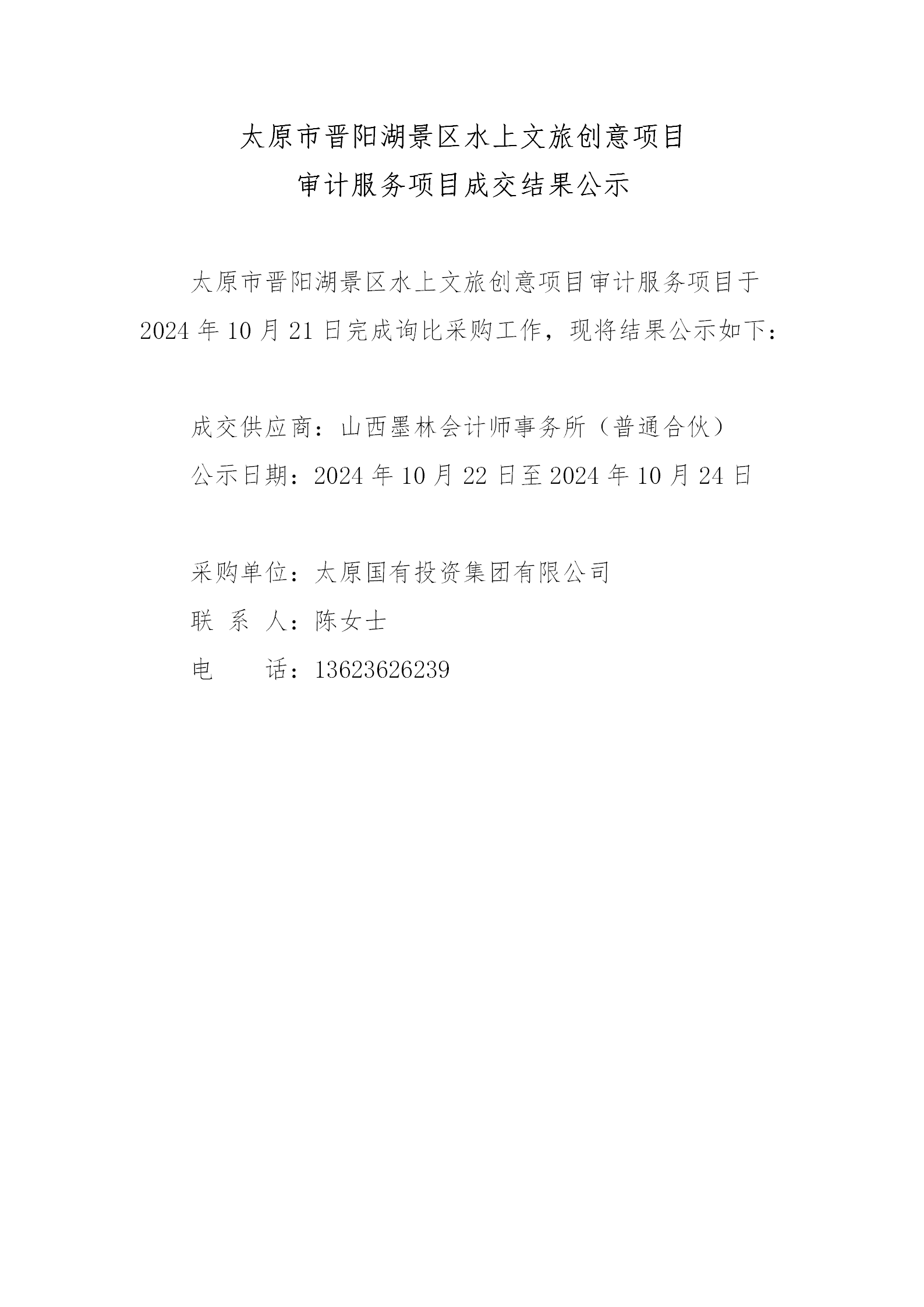 太原市晉陽湖景區(qū)水上文旅創(chuàng)意項目審計服務詢比成交結果公示