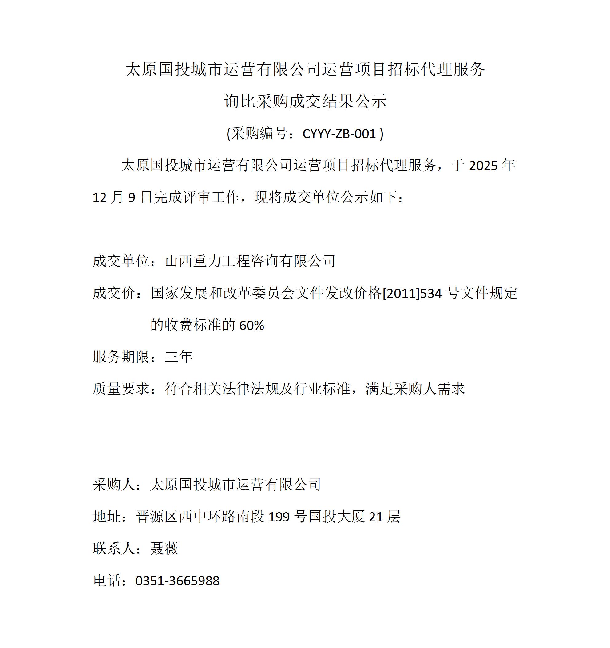 太原國投城市運營有限公司運營項目招標代理服務采購項目詢比采購成交結(jié)果公示