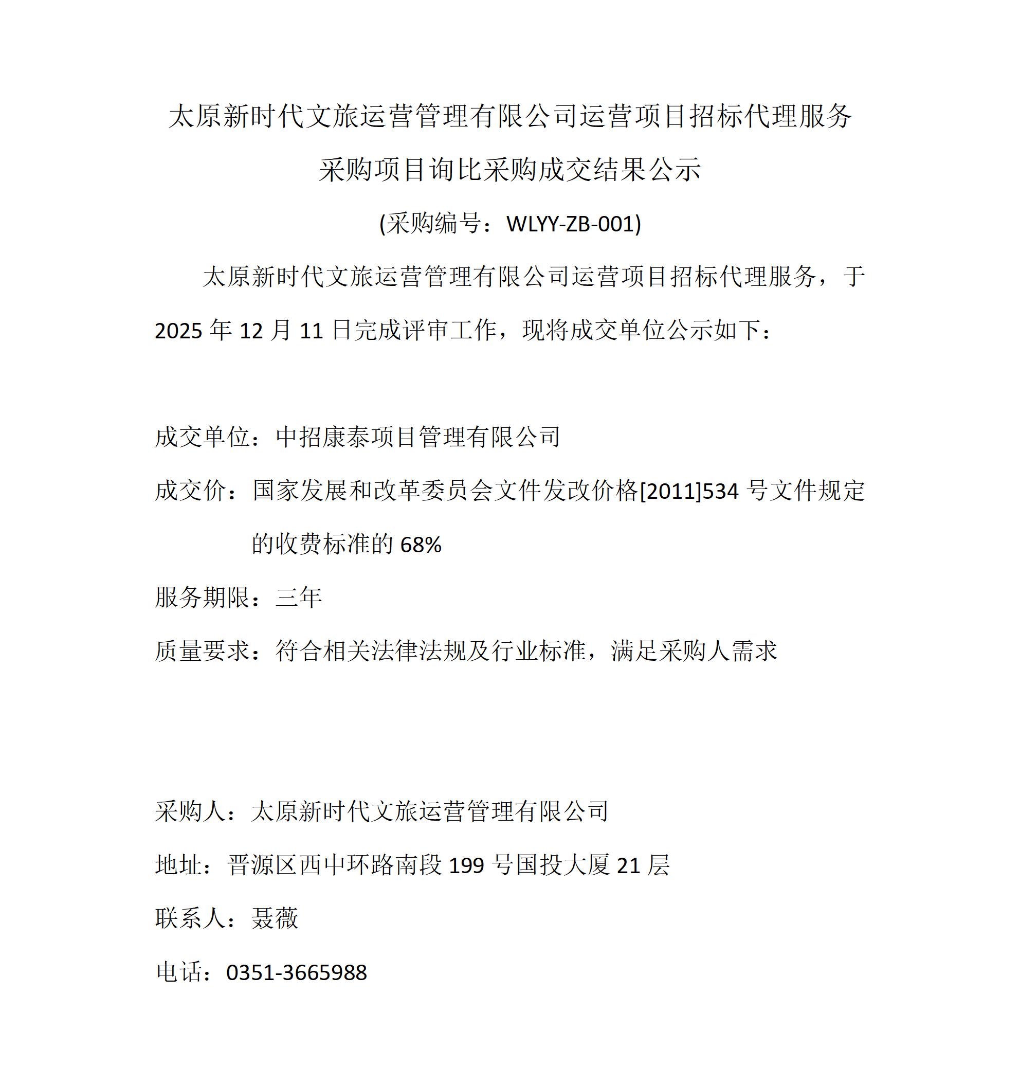 太原新時(shí)代文旅運(yùn)營(yíng)管理有限公司運(yùn)營(yíng)項(xiàng)目招標(biāo)代理服務(wù)采購(gòu)項(xiàng)目詢(xún)比采購(gòu)成交結(jié)果公示
