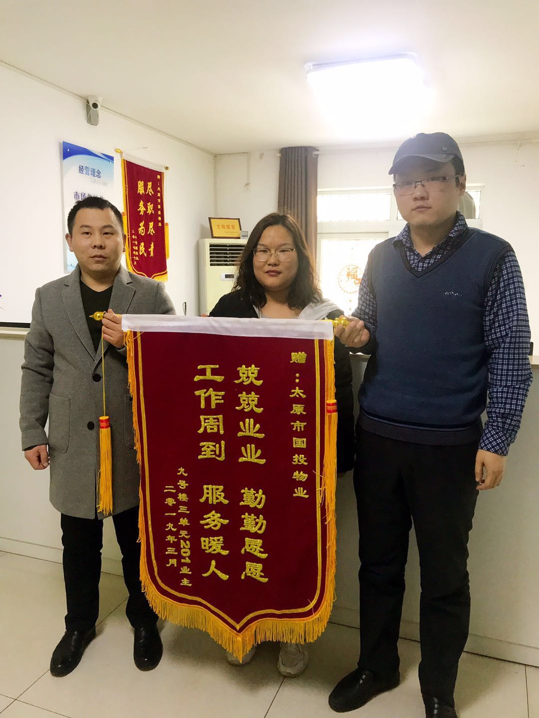 3月4日下午,國(guó)投物業(yè)公司收到小區(qū)9號(hào)樓3單元業(yè)主送來(lái)“兢兢業(yè)業(yè)、勤勤懇懇、工作周到、服務(wù)暖人”錦旗一幅。該業(yè)主表示,自入住以來(lái)常和收費(fèi)處的員工打交道,他們總是細(xì)心周到、耐心解釋,數(shù)年如一日的服務(wù)讓業(yè)主深為感動(dòng)。本次送錦旗既是物業(yè)日常工作的鮮明寫照,也是物業(yè)全體工作人員努力奮斗的方向。